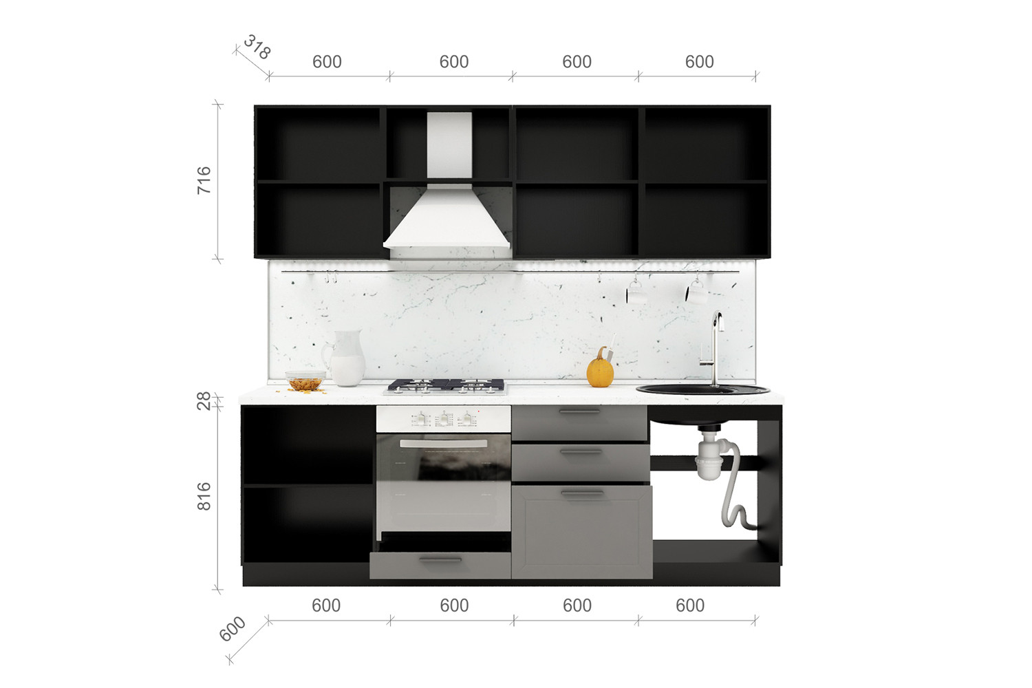 Общая ширина кухни: 2400 мм