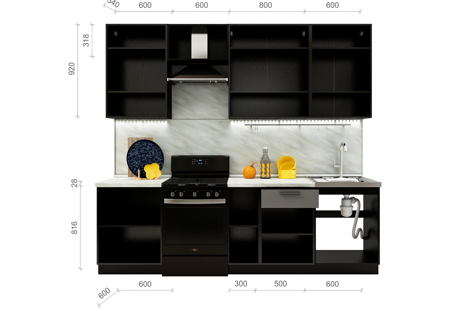 Материал фасада и корпуса: ЛДСП 16 мм. Ширина кухни 220 см.