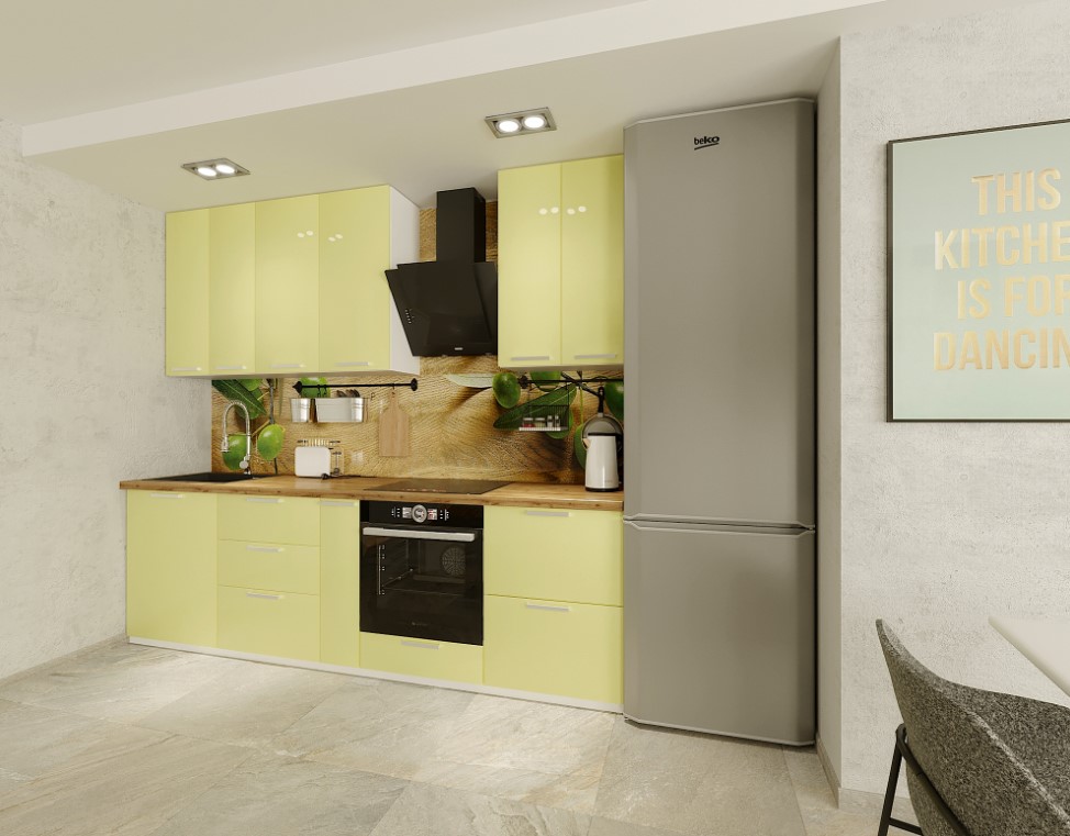 Фасады с фрезеровкой, витражная вставка. Ширина кухни 210 см.