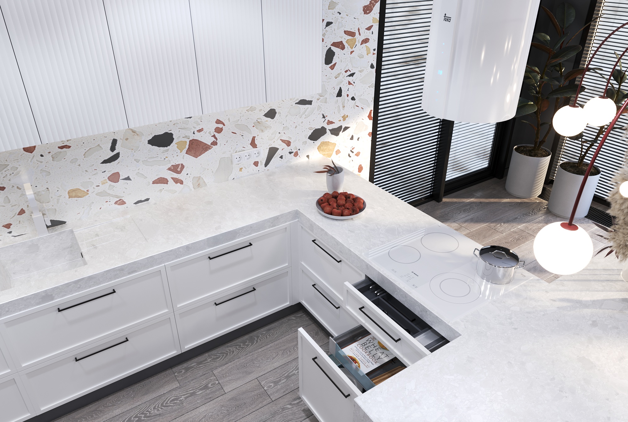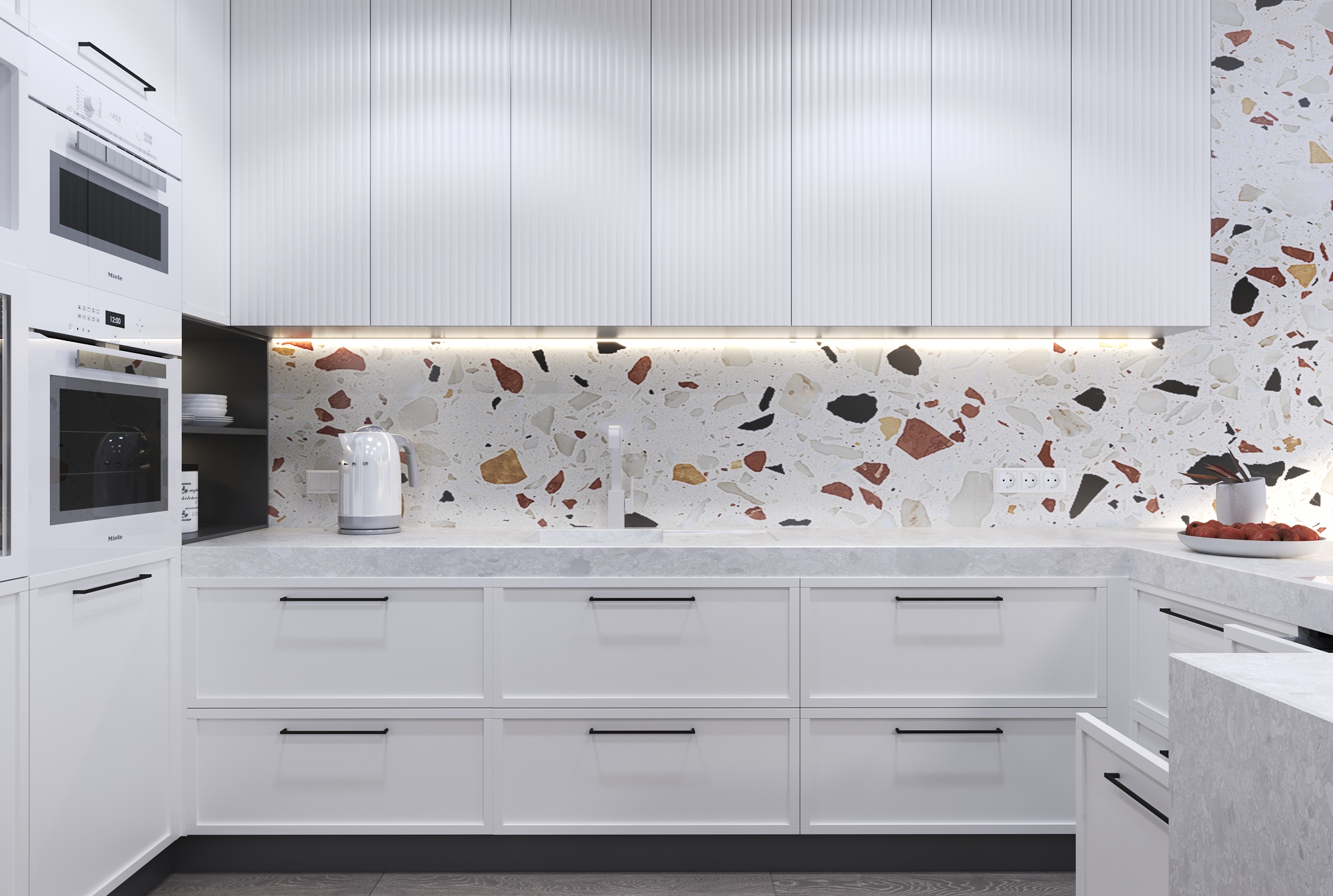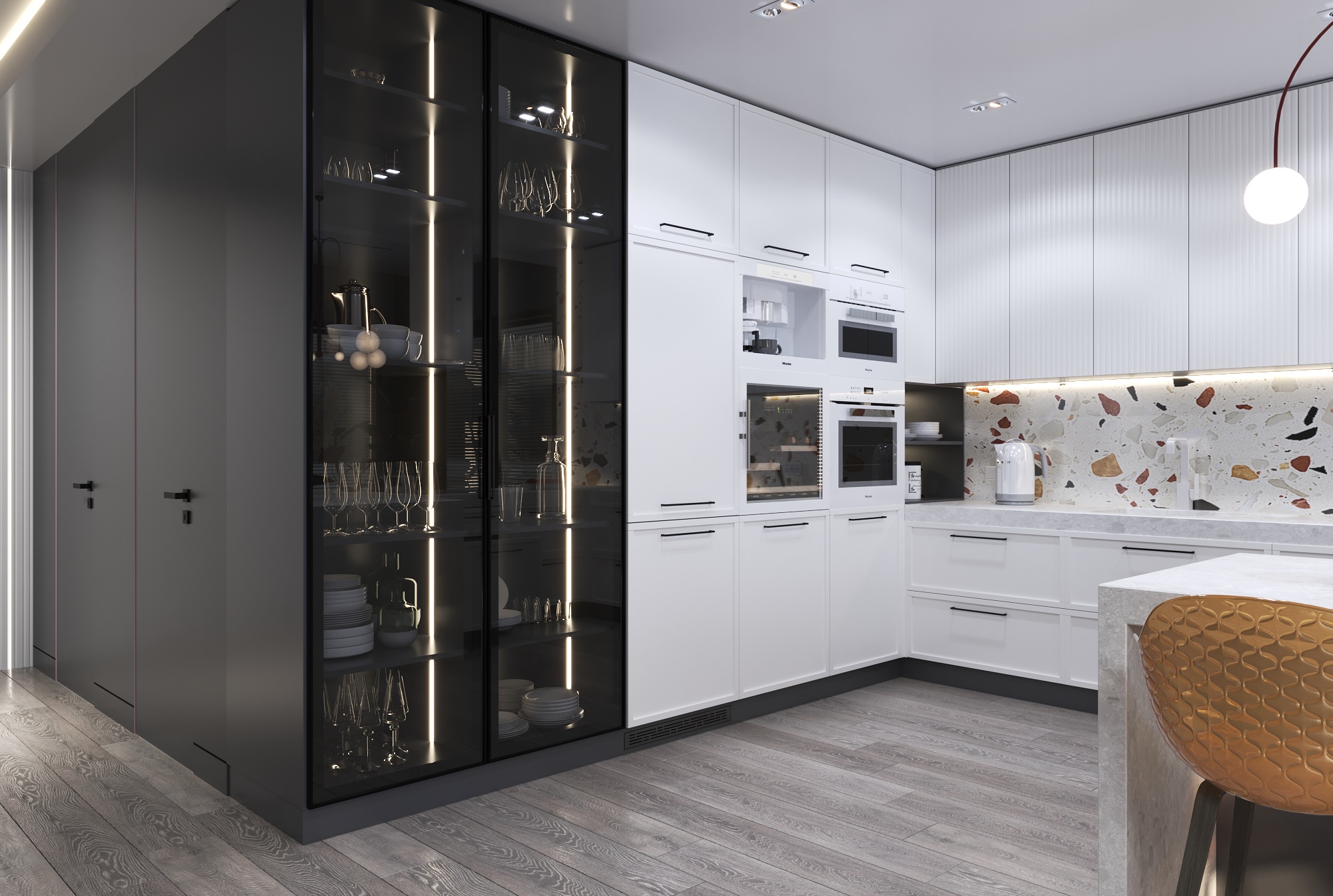 Комбинированный серо-белый цвет. Столешница цвета сонома.