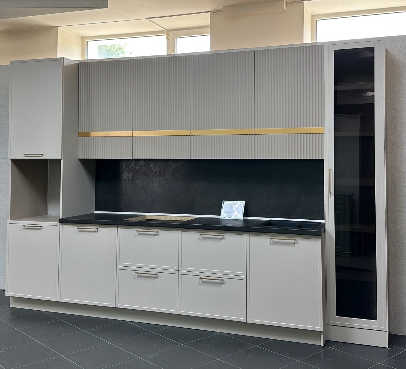 Стеклянные вставки на дверцах верхних модулей.