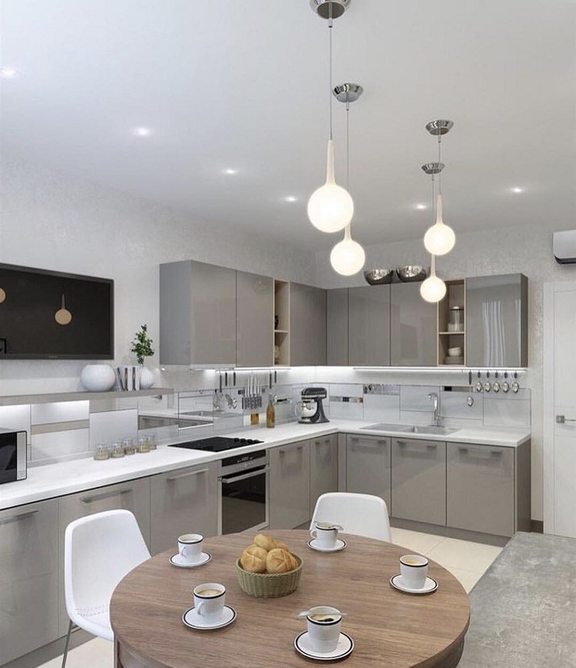 Стильная элегантная кухня представлена в безупречном универсальном цвете. В составе гарнитура имеются как напольные, так и подвесные модули с глянцевыми фасадами. Современная фурнитура позволят створкам шкафчиков работать плавно и почти бесшумно.