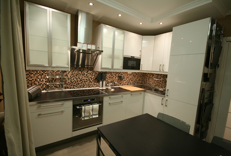 Конструкция данной модели предполагает специальное пространство для духового шкафа и плиты, вытяжки и другой бытовой техники упрощающей быт. Эффект дополняется отличными эстетическими качествам: лучшие черты современного дизайна при проектировке кухонь можно увидеть на данном примере.