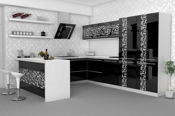 Кухня исполнена в черном цвете. П-образная форма обеспечит комфортную работу и возможность держать все необходимые предметы под рукой. На фасады нанесен декоративный орнамент белого цвета. Глянцевое покрытие создаст занимательную игру света и отражений.