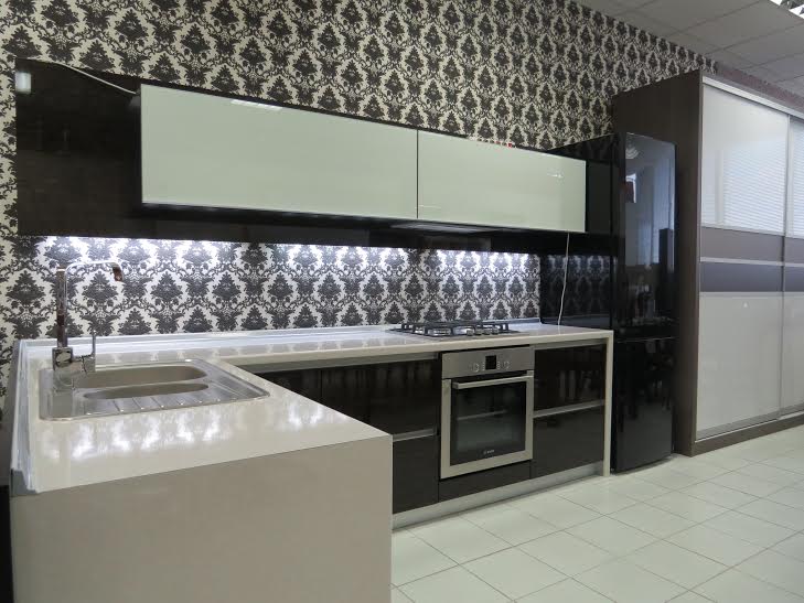 Стильная функциональная кухня за счет системы Push To Open открываются плавно и совершенно бесшумно. Глянцевый фасад делает внешний вид конструкции более роскошным и элегантным. Ударопрочная светлая столешница прекрасно гармонирует с темным оттенком фасадом.