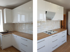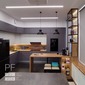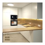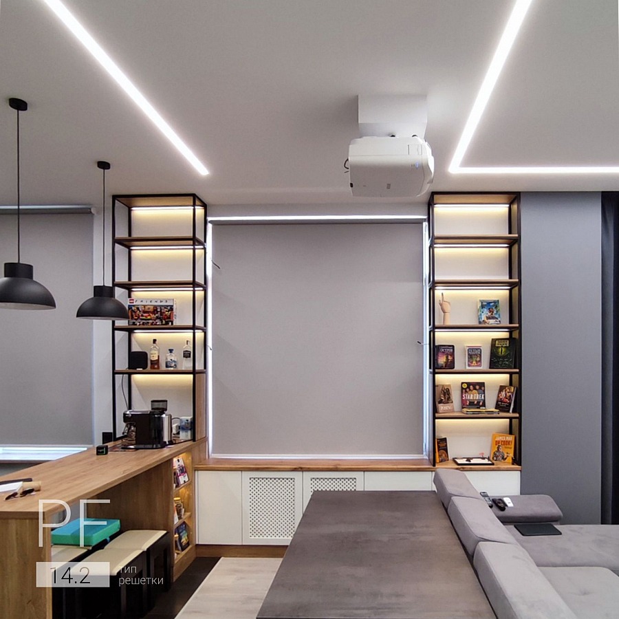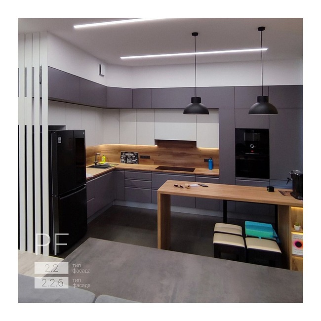Для этого проекта наша компания изготовила крашеные фасады на основе МДФ в матовом покрытии. Выбраны две модели фасадов - 2.2.6 с интегрированной ручкой и 2.2. Отсутствие лицевой фурнитуры сохраняет формы фасадов чистыми, что на такой большой кухне помогает не перегружать лишними деталями внешний вид. Темный серый NCS S 6000-N и белый RAL 9003 в сочетании с древесными элементами в одном декоре (столешница, скинали, полки) не скучное и выразительное цветовое решение. Радиаторы декорированы решеткой тип 14.2 на основе МДФ в цвет фасадов.