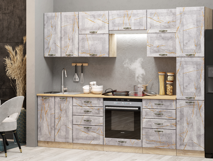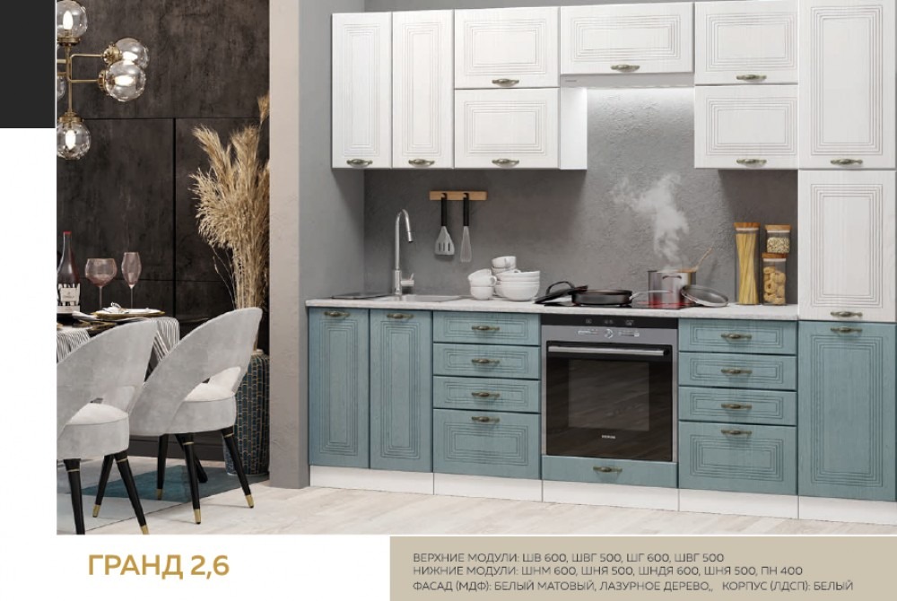 Цена указана за кухню шириной 2,6 метра. Пенал 400 мм. Сверху сушка 600 мм, два шкафа 500мм горизонт, газовка 600 мм. Снизу: мойка 600 мм, два шкафа 500 мм с ящиками, духовка.