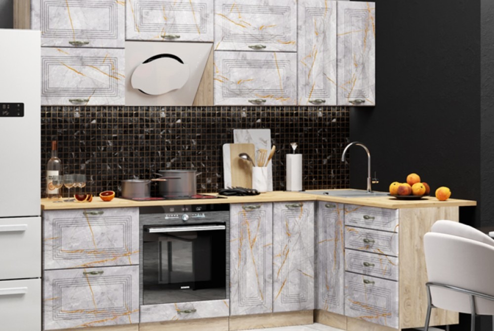Материал фасада и корпуса: ЛДСП 16 мм. Ширина кухни 230 см.