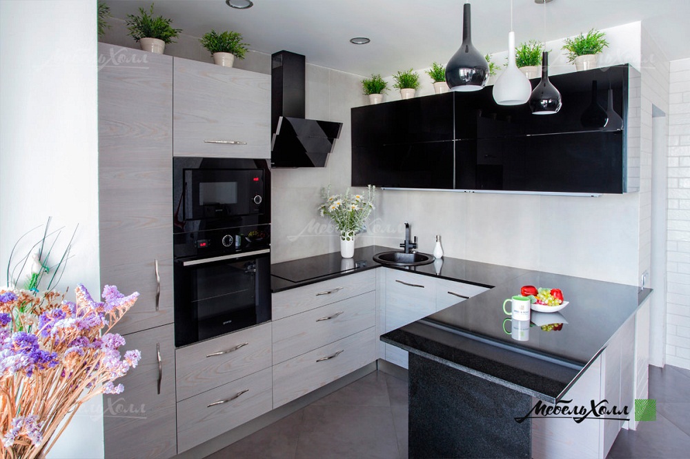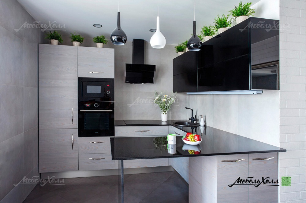 Угловая кухня с барной стойкой. Фасады привлекают сочетанием черного глянца и текстуры дерева.