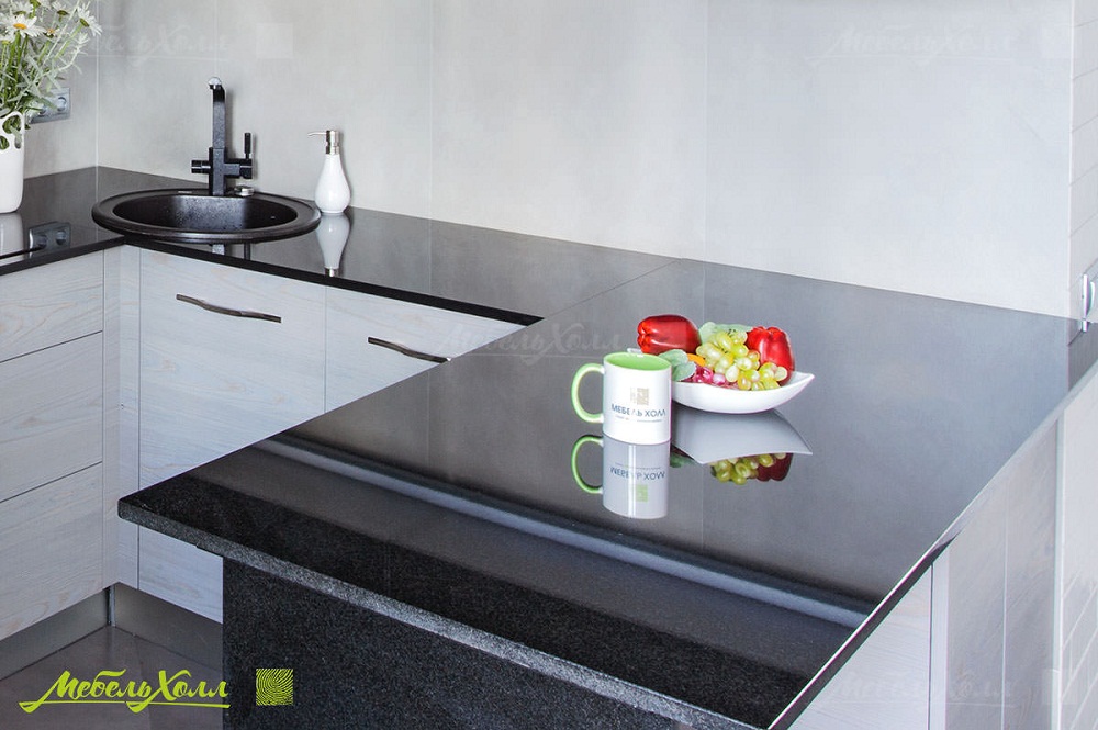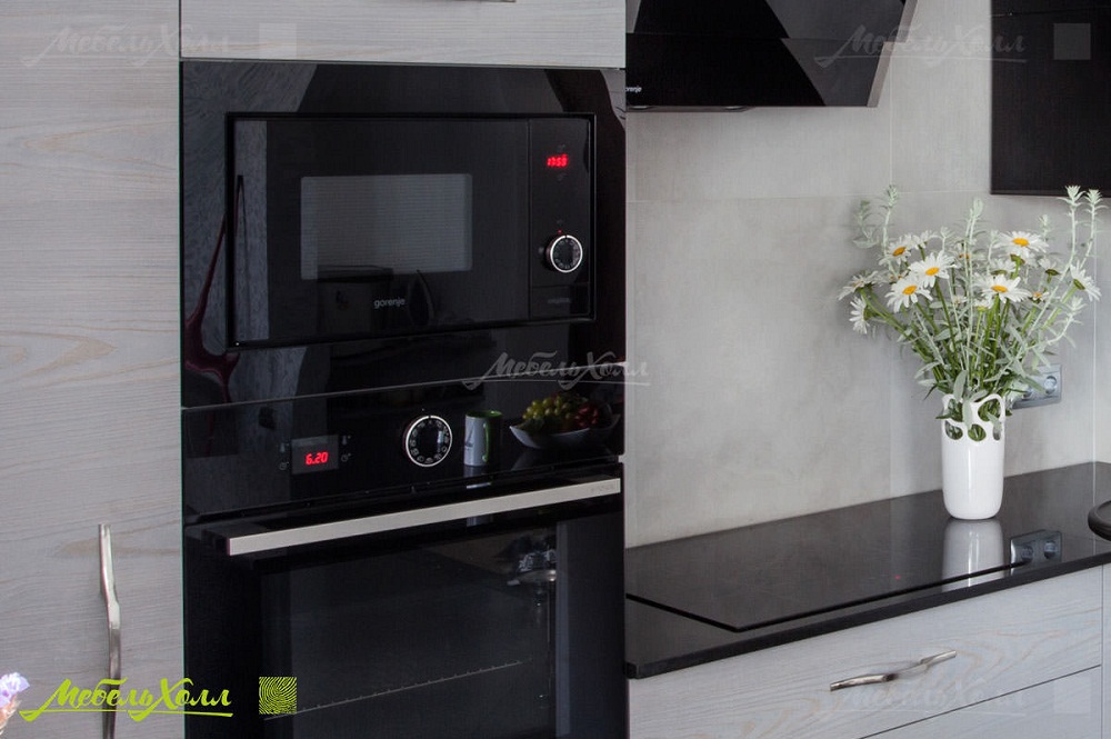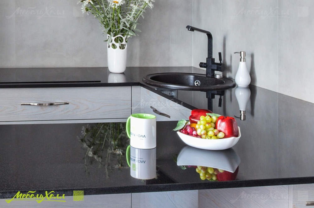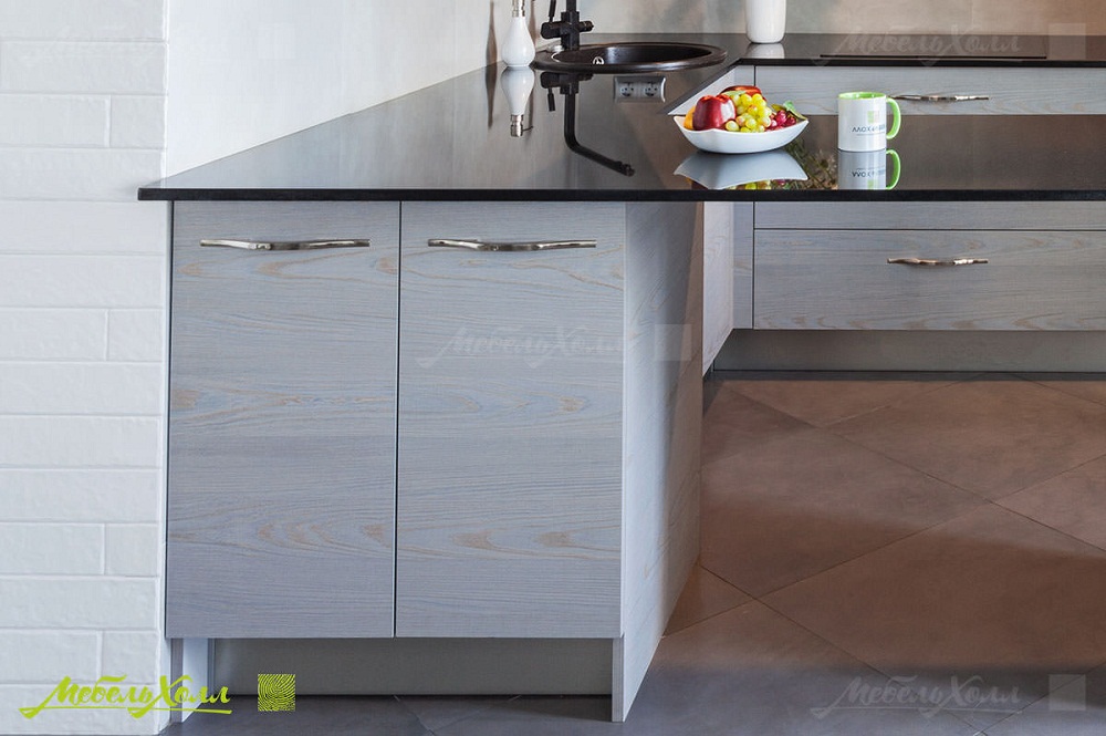 Угловая кухня в сером цвете из ДСП с черными глянцевыми верхом. Нижние фасады выполнены из ДСП Cleaf коллекции Azimut, верхние - строгий черный глянец из МДФ Niemann. Функциональность, вместительность и удобство пользования обеспечена системами хранения и фурнитурой Blum (Австрия). Ручки Metakor Toledo дополняют стиль "модерн" этой уютной кухни. Особое внимание рекомендуем обратить на столешницу из кварцевого композита - современный материал чрезвычайно долговечен и устойчив к различного вида воздействиям: как химическим, там и механическим - классическая текстура и черный цвет придают особый шик всей кухне.
