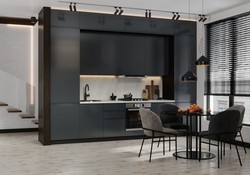 Темные и светлые фасады из пленочной МДФ. Ширина кухни 210 см.