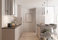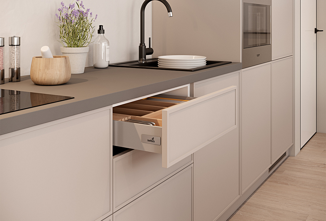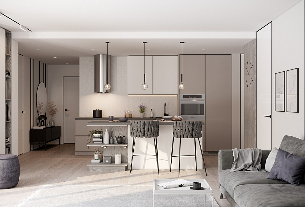 Матовые фасады в нейтральных серо-бежевых тонах.