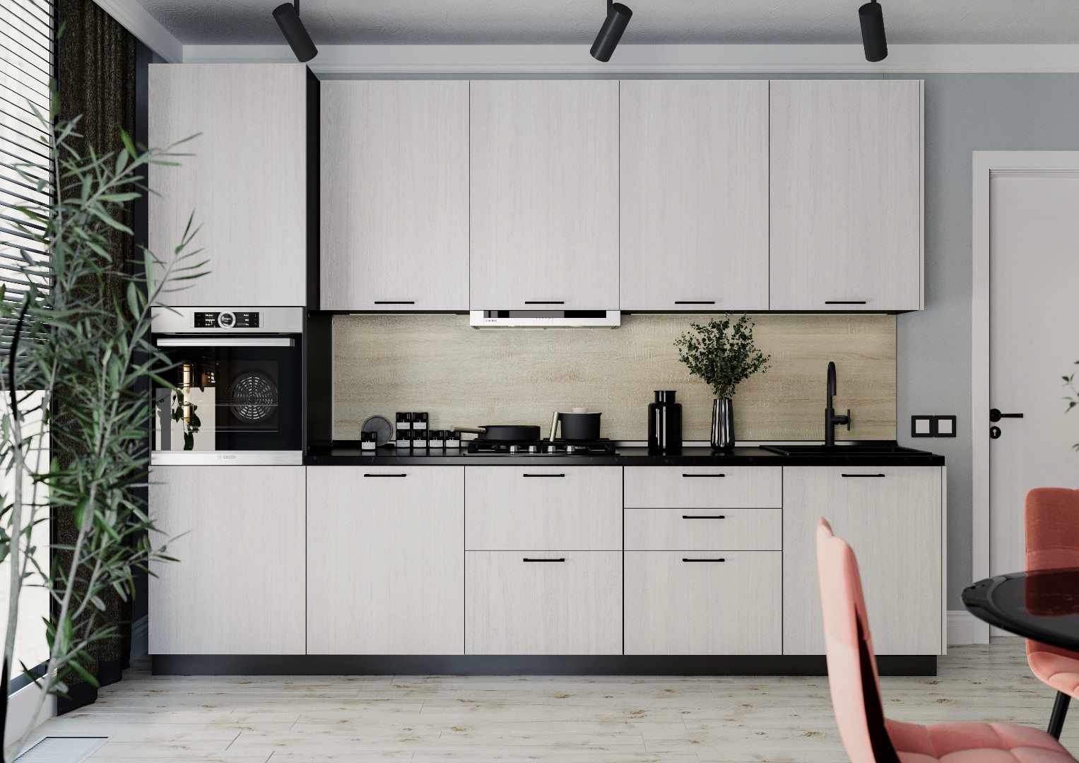 Линейная кухня со строгим прямоугольным дизайном