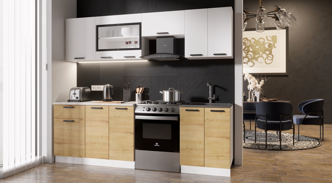 Готовый гарнитур с комбинированными фасадами из ЛДСП. Ширина кухни 230 см.