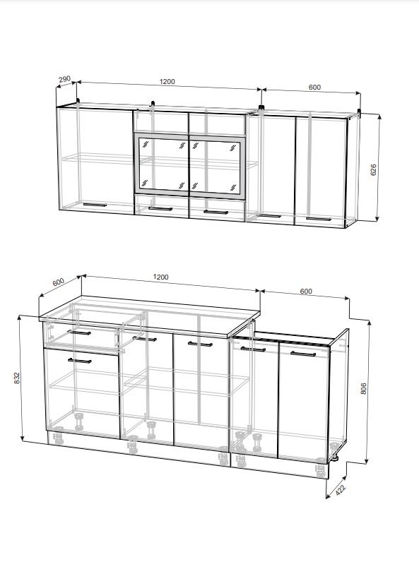 Верхние фасады со стеклом. Ширина кухни 160 см.