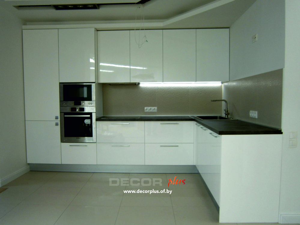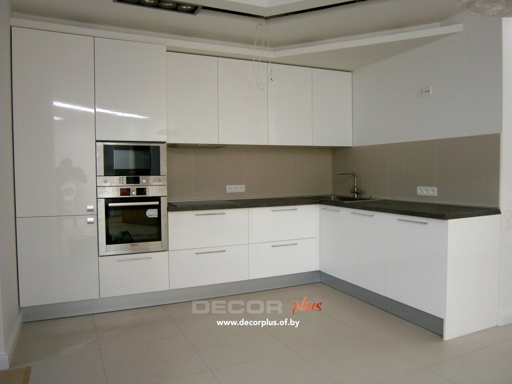 код 85045Белая глянцевая угловая кухня с серой столешницей. Есть ниши для встроенной техники.