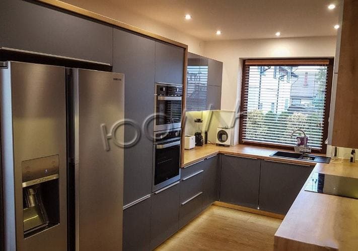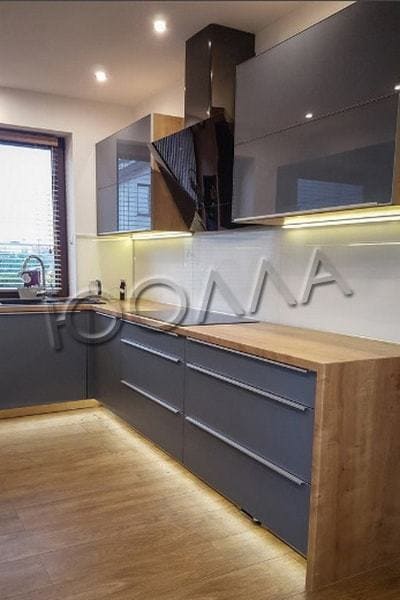 Кухня изготовлена со скрытыми креплениями и фурнитурой по немецкой технологии "Фолдинг".