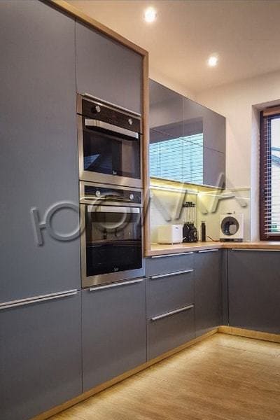 П-образный кухонный гарнитур с нишей для холодильника и встроенным духовым шкафом. Корпуса отделаны в тонах светлых пород древесины, в том числе столешница и торцы шкафчиков. Матовые фасады серовато-синего оттенка с профильными ручками, навесной модуль глянцевый.