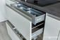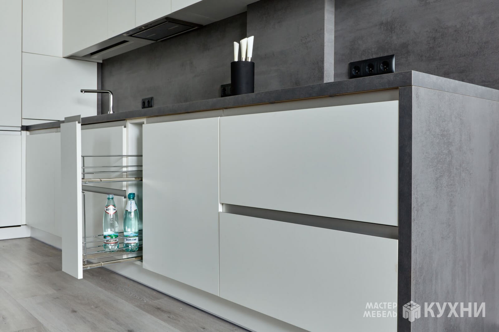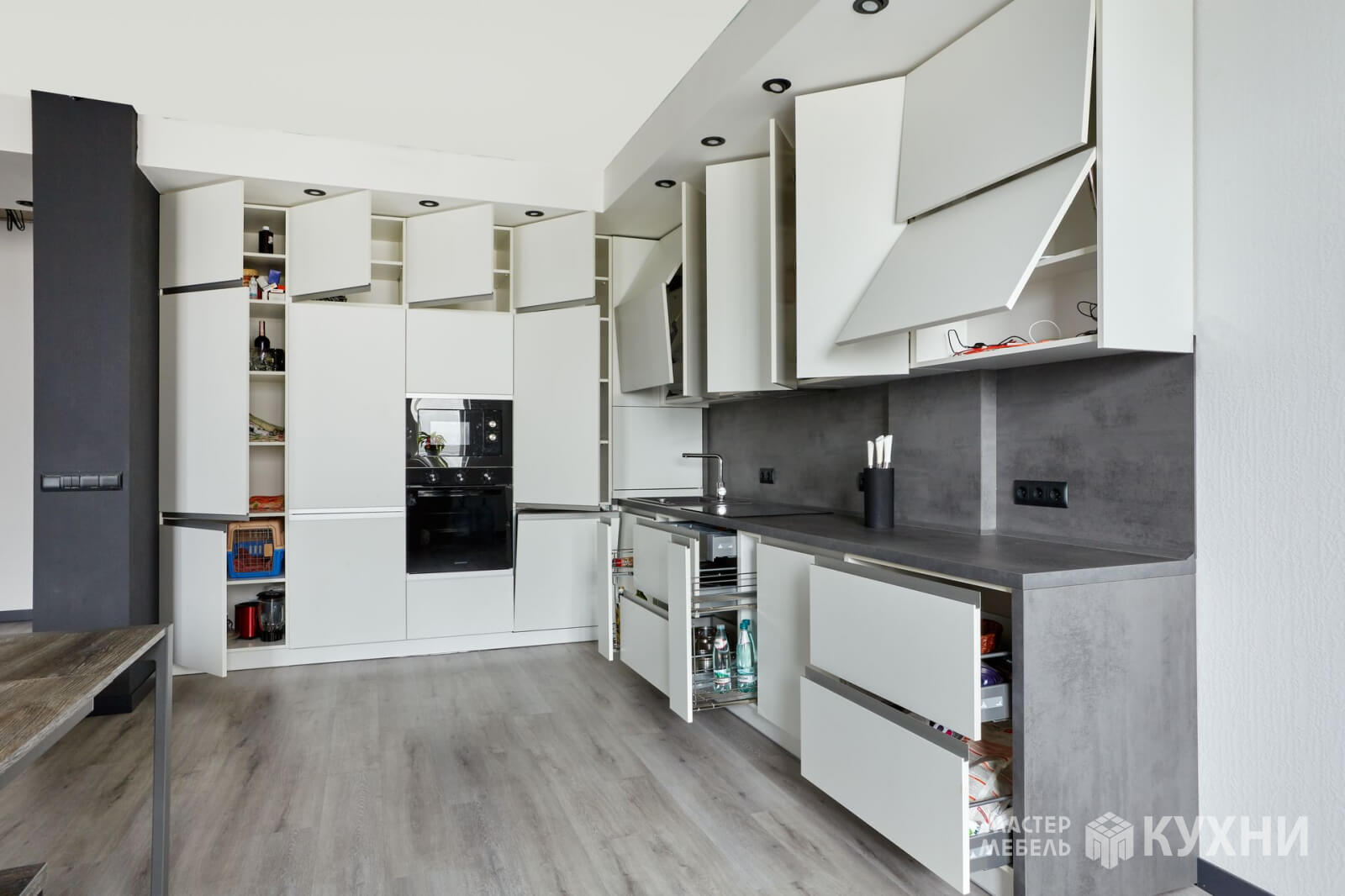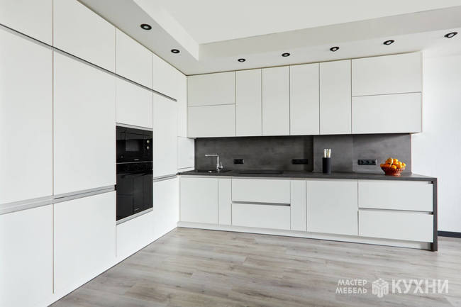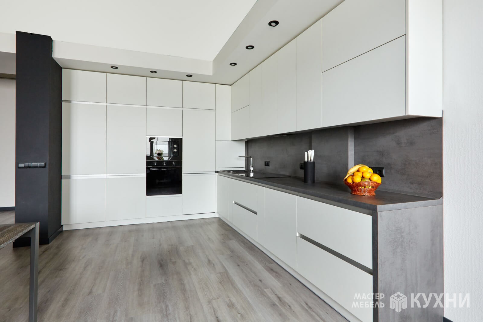 код 101837Большая угловая кухня с матовыми фасадами без ручек. Ниши для встроенной бытовой техники