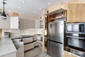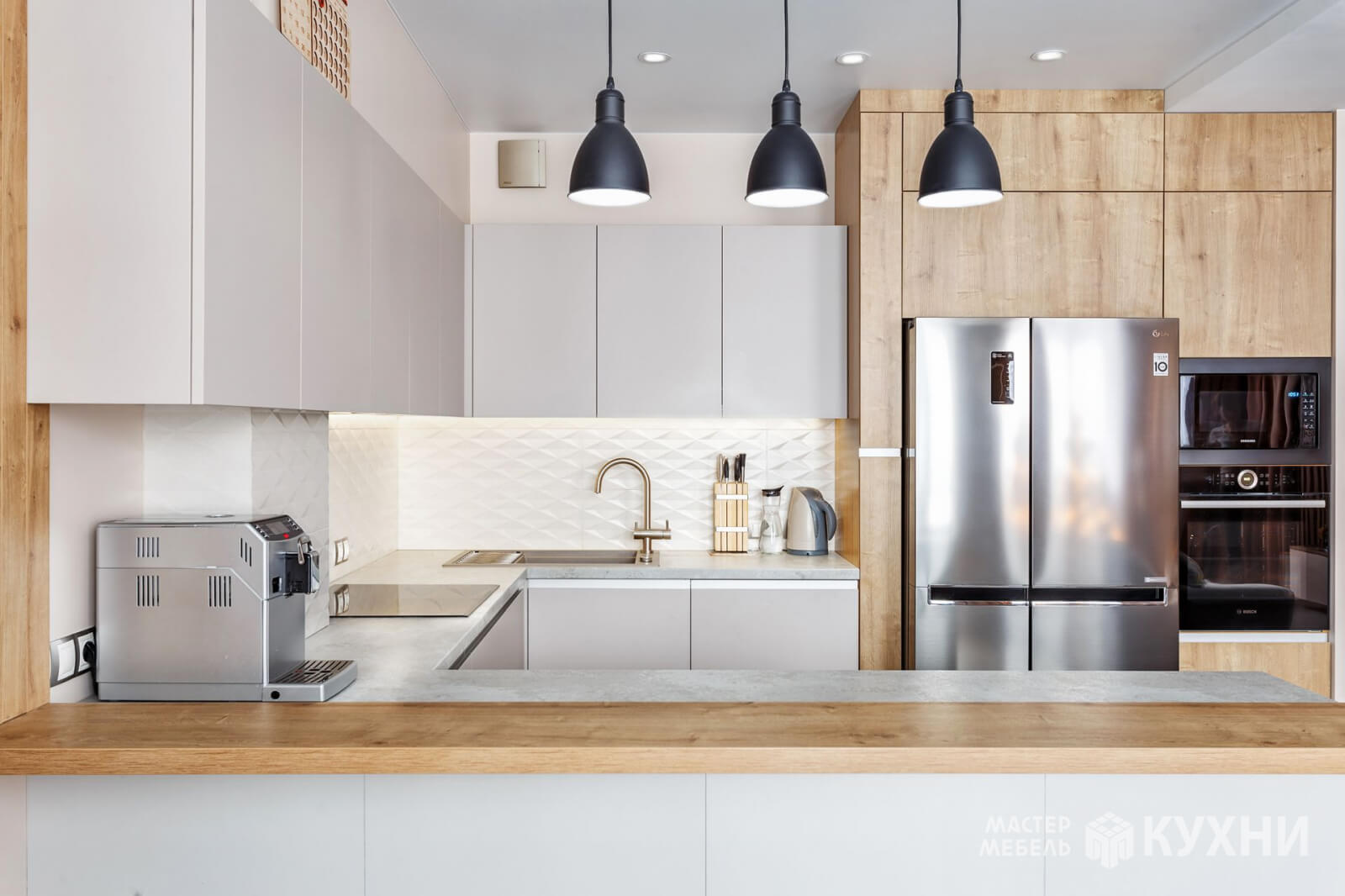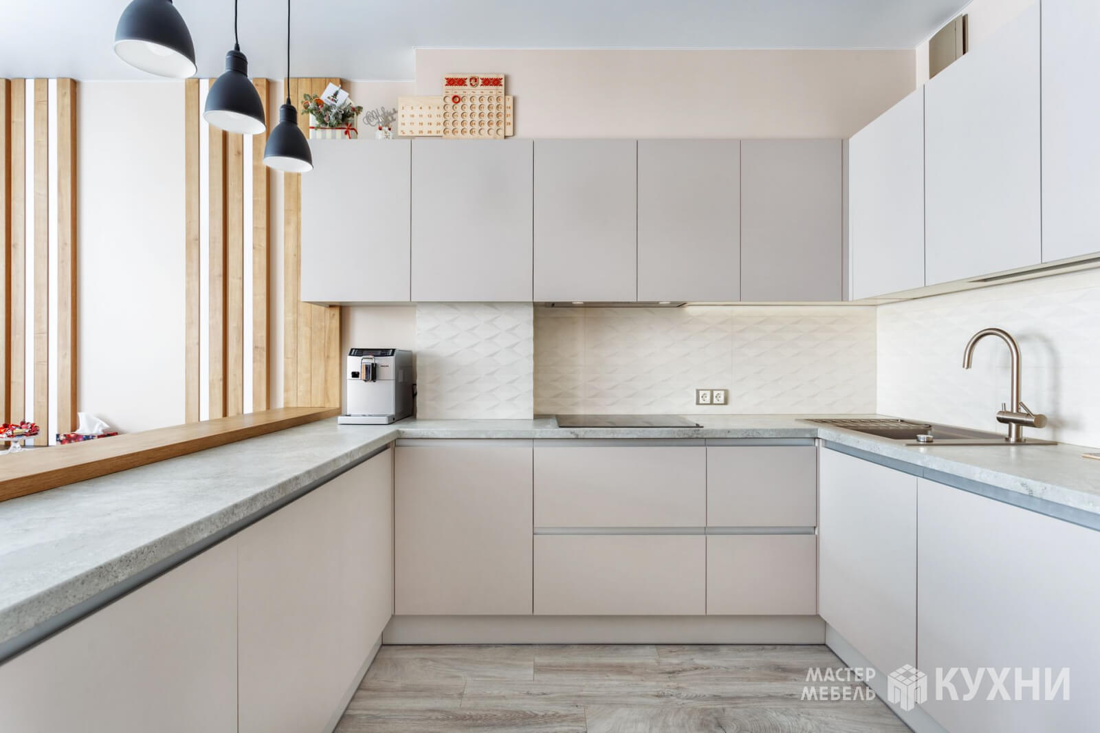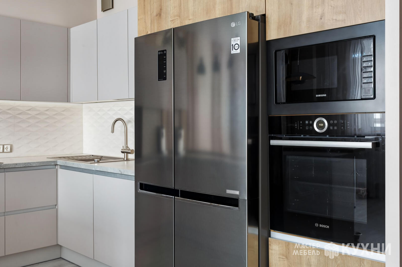 Комбинированные матовые фасады без ручек, ниши для техники,