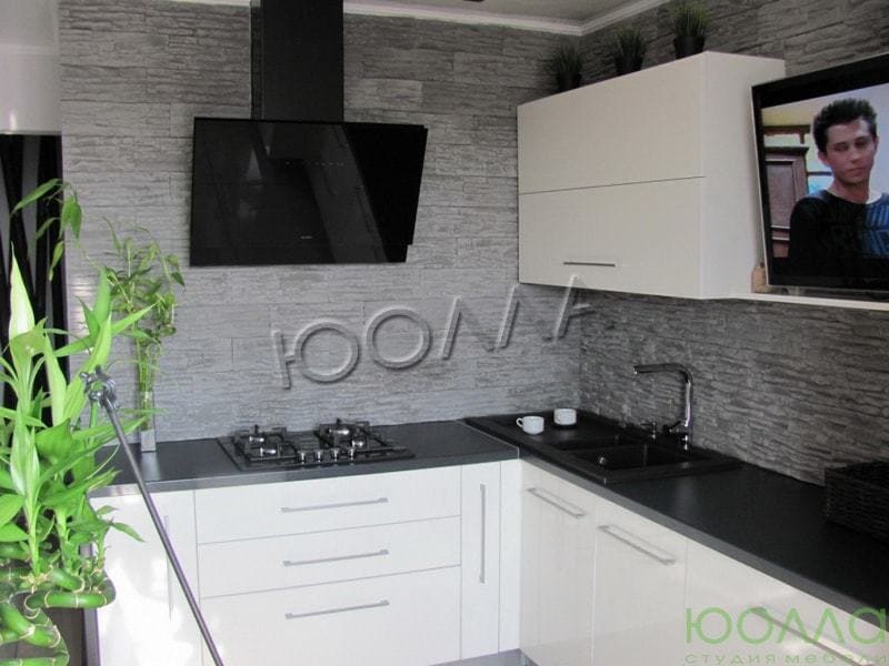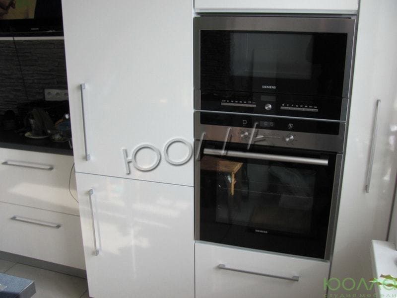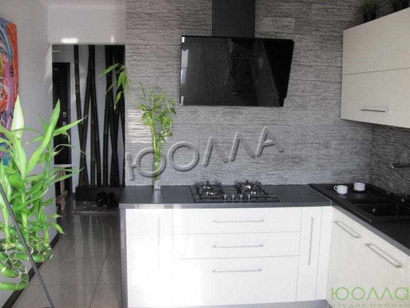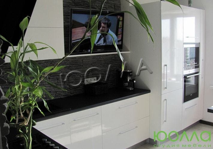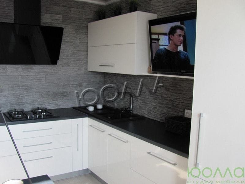 Контрастная угловая кухня с белым глянцевым фасадом и черной столешницей. Невысокий буфет с нишами для встроенного духового шкафа и холодильника. Компактный и удобный навесной модуль.