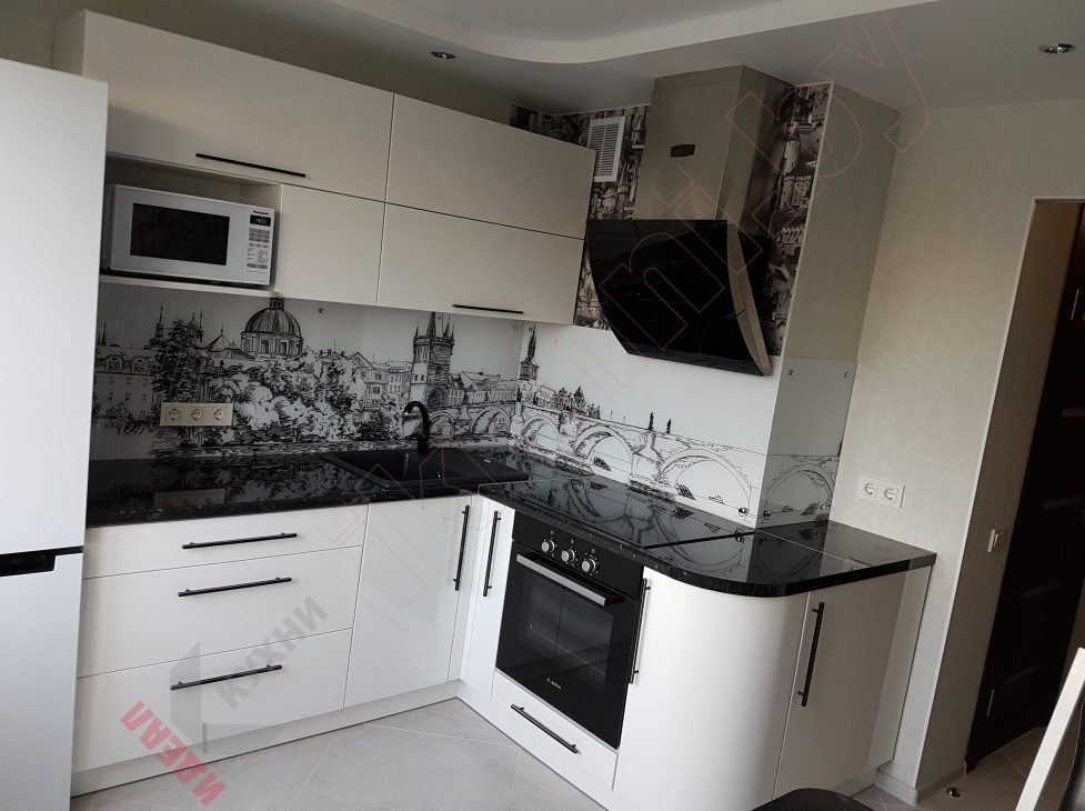 Современная угловая кухня в серых тонах. Верхние фасады без ручек.