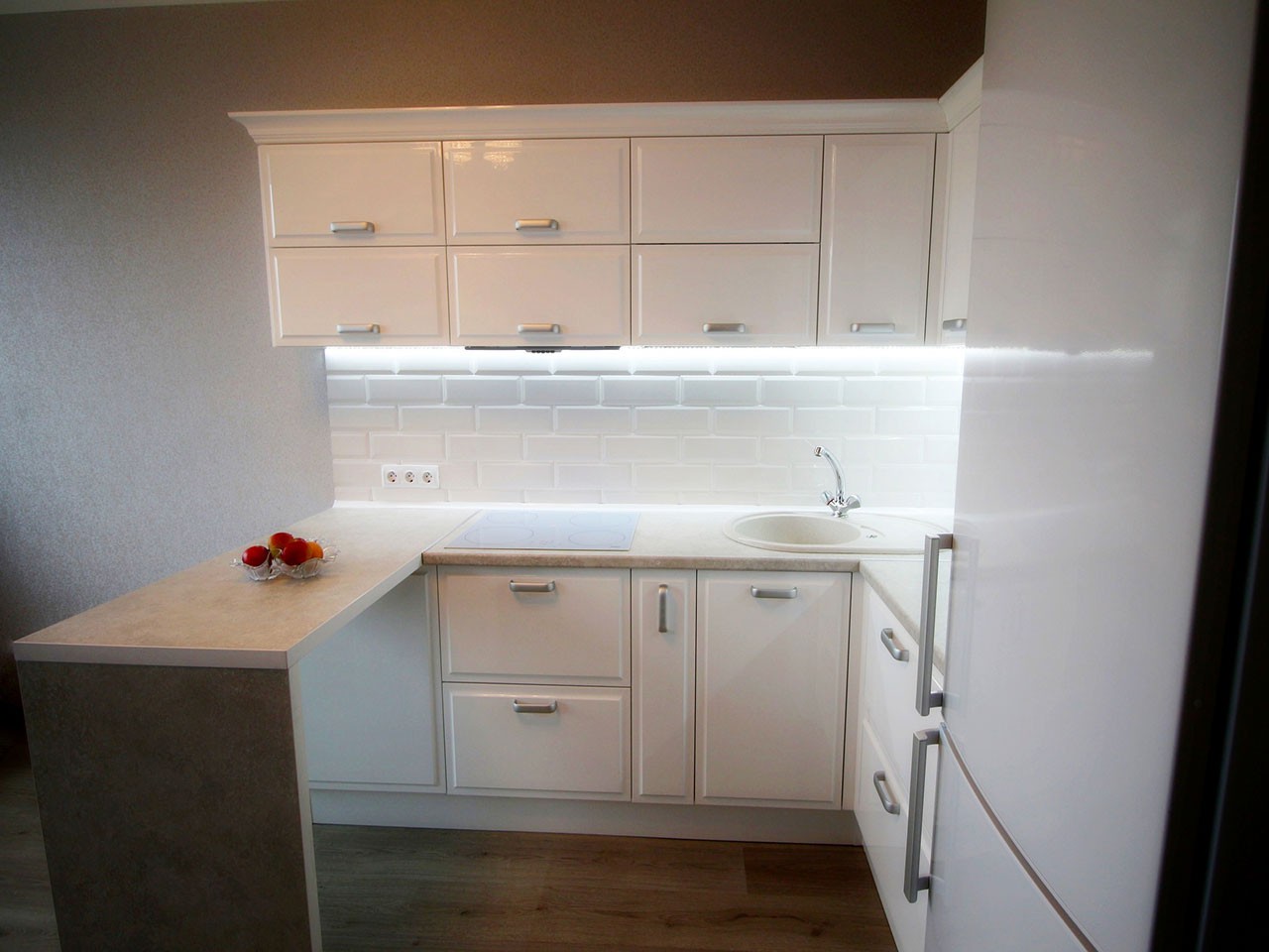 Фасадная часть кухни выполнена из крашеного МДФ толщиной 25 мм в цвете белый глянец. Каркас исполнен из ЛДСП KRONOSPAN. Столешница на кухонном гарнитуре производства PFLEIDERER (Польша). Внутреннее наполнение и фурнитура: петли с доводчиками, выдвижные ящики tandembox (7 шт.), складной подъемный механизм AVENTOS-HF (1 шт.), подъемные механизмы AVENTOS-HК (6 шт.) — производства BLUM (Австрия). Выдвижная корзина карго 150 мм – Hettich (Германия). Ручки (UZ-G1). Кухня также оснащена сушкой для посуды, вкладышем для столовых приборов и пластиковым цоколем 150 мм польского производства.