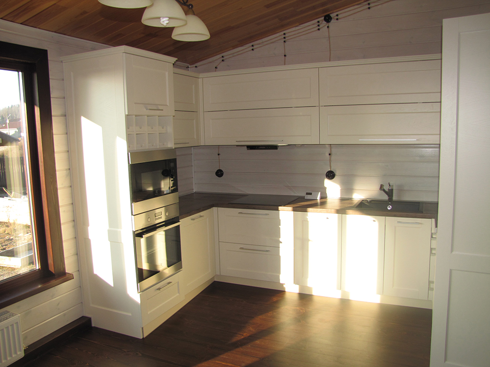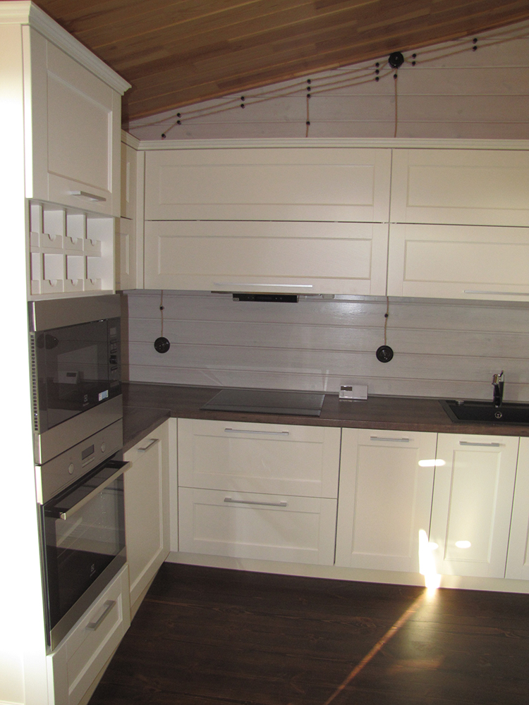 Представленная модель кухни выполнена из массива дуба. Фасады гарнитура исполнены в белом цвете. Столешница в контраст фасадам исполнена в темном цвете натурального дерева. Гарнитур приятно дополняет интерьер и придает ему изысканности за счет использованных природных материалов.