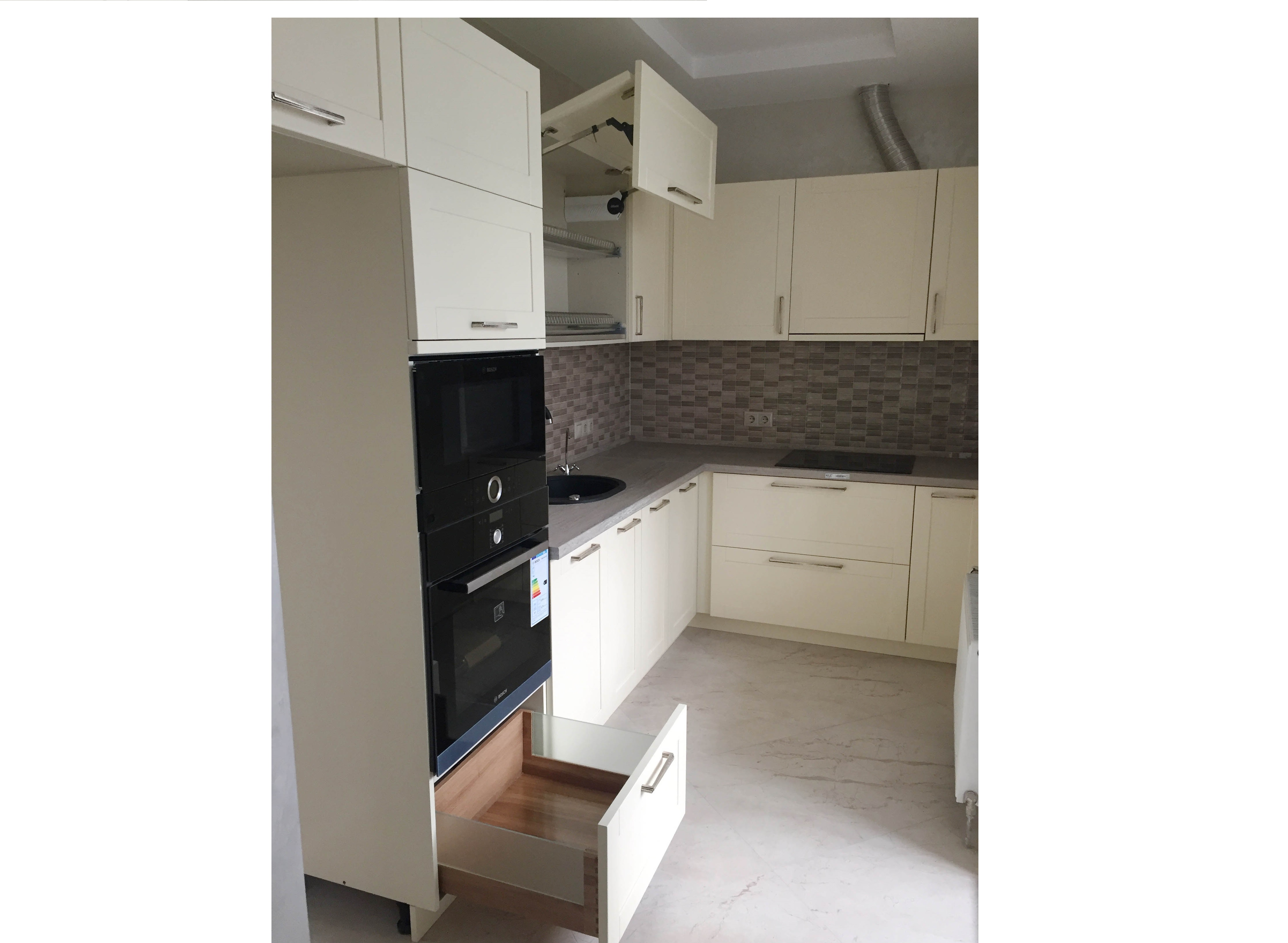 Фурнитура: выдвижные механизмы Hettich (Германия), подъемные механизмы и петли BLUM (Австрия), дополнительные комплектующие Inoxa (Италия), ручки Giusti (Италия).
