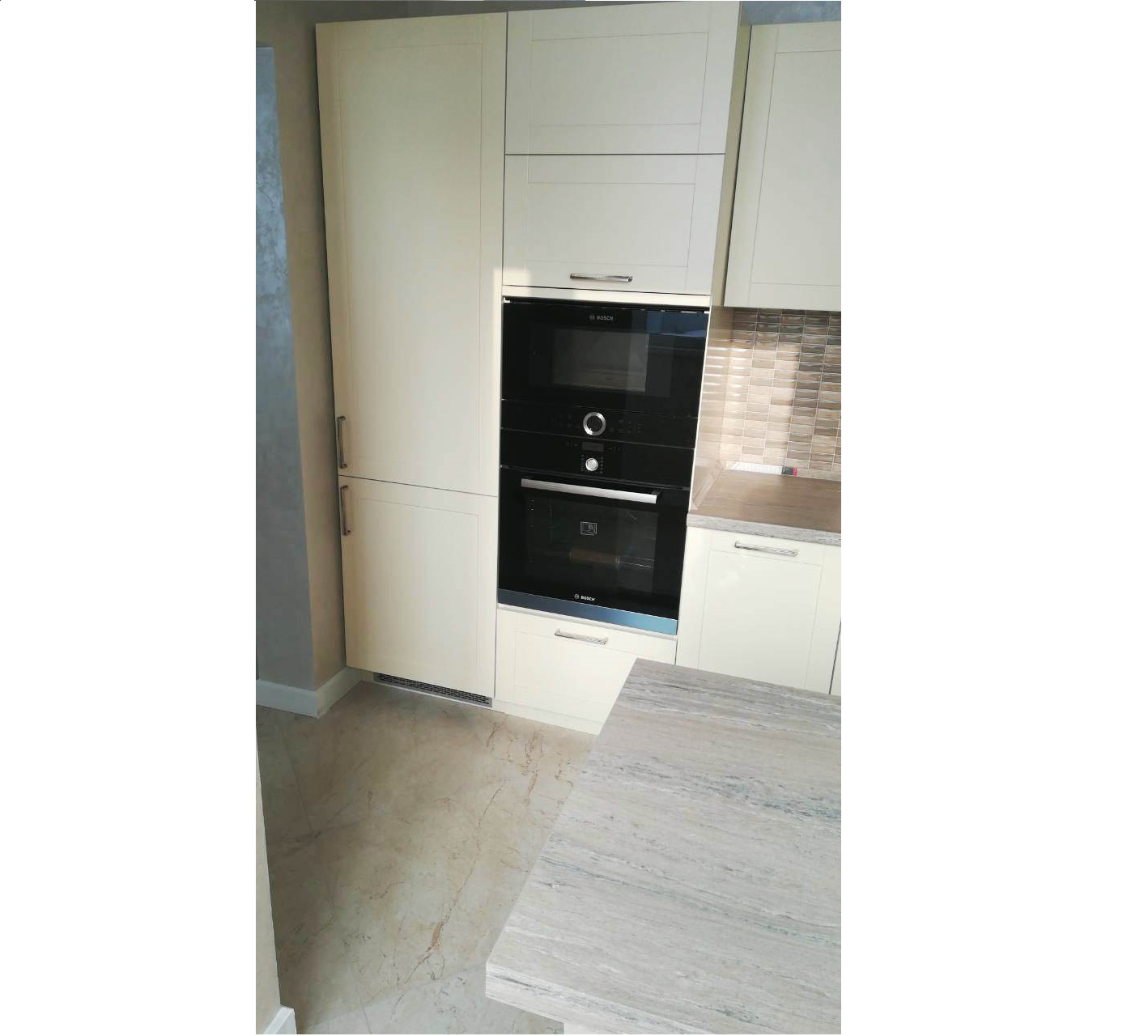 Столешница в тонах светлой древесины. Белый матовый фасад. Верх без ручек.