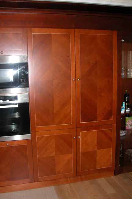 Элитная кухня из массива объединила в своем декоре классические и современные элементы. За классику отвечает материал изготовления каркаса и нижних фасадов – натуральный массив с отделкой натуральным же шпоном. Последний выполняет еще и декоративную функцию: панели шпона имеют различное направление волокон, образуя на поверхности необычный геометрический рисунок.