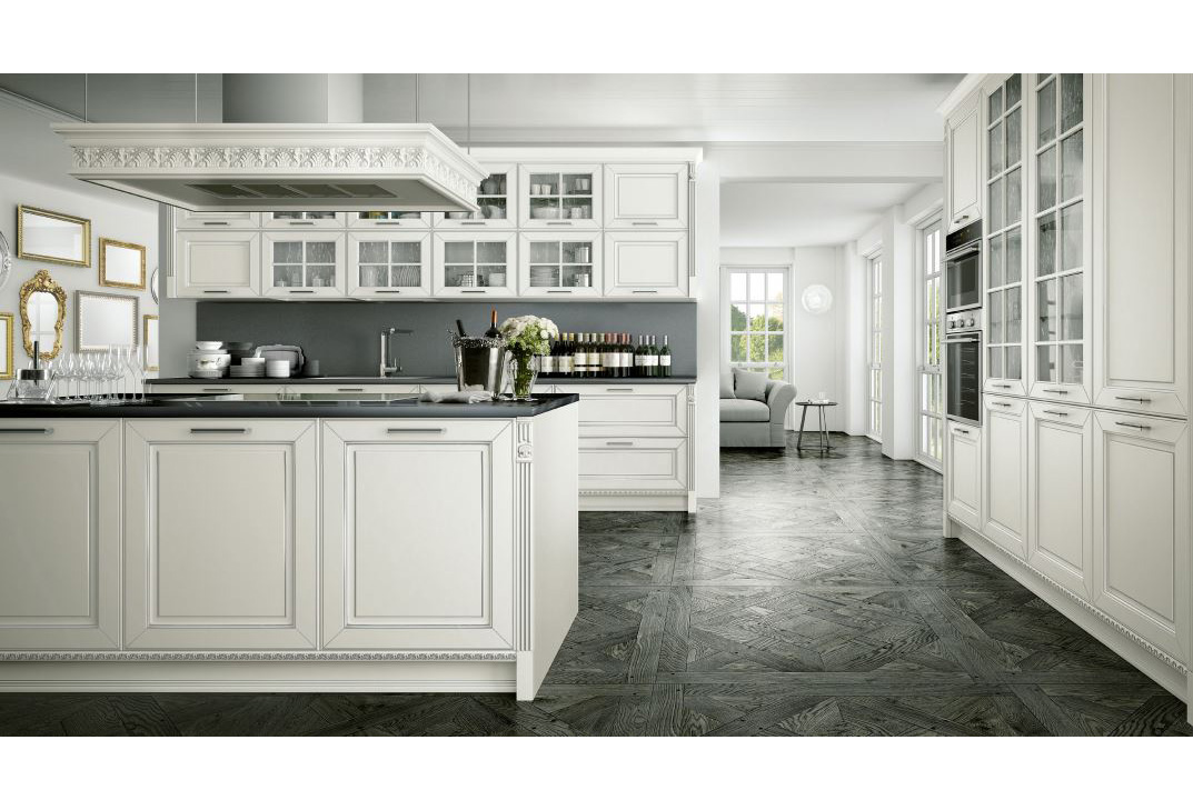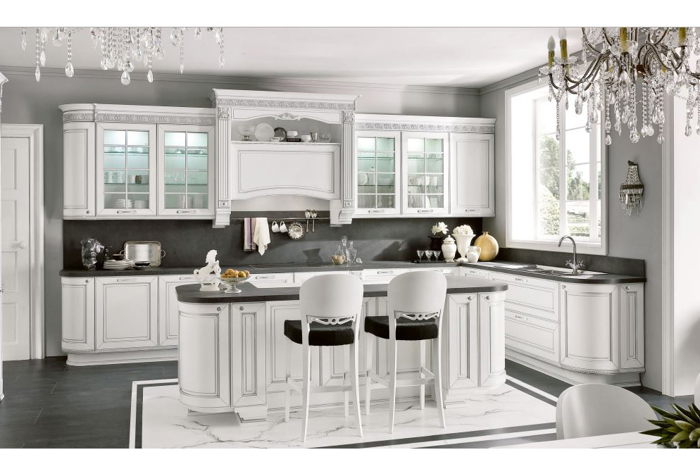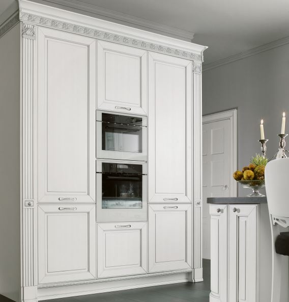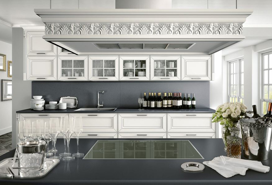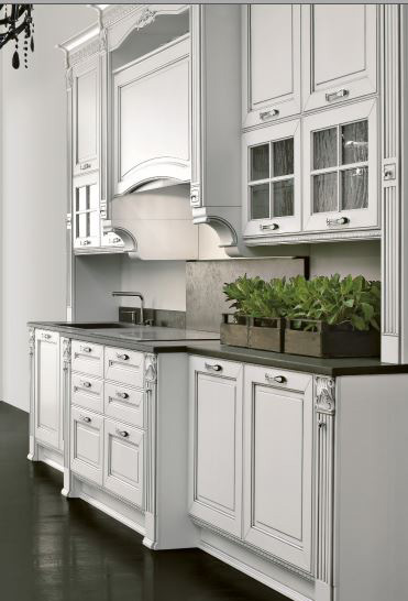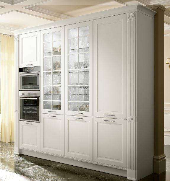 Кухонный гарнитур в классическом стиле. Фасады с филенкой и витражами.