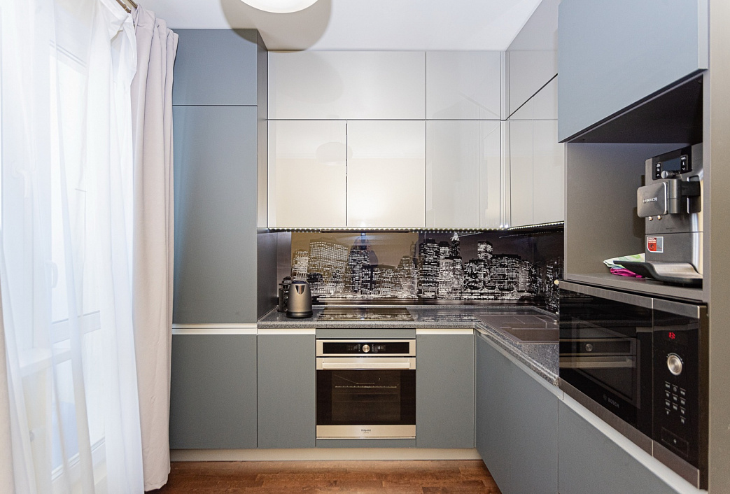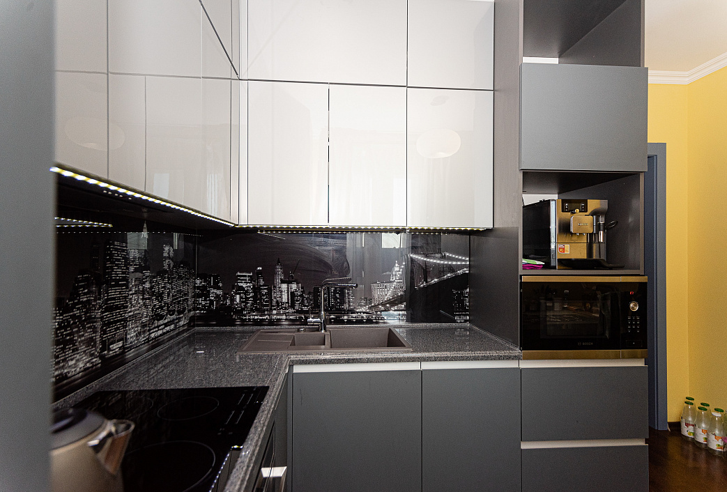 Готовый гарнитур с комбинированными фасадами из ЛДСП. Ширина кухни 110 см.