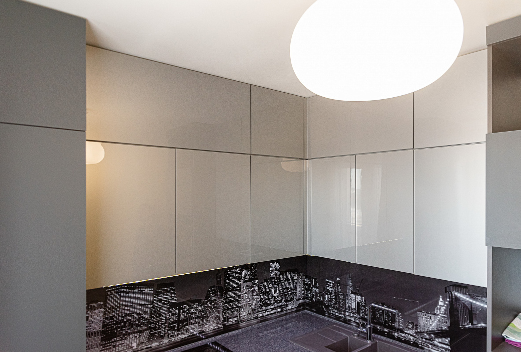 Необычный дизайн верхних шкафчиков со вставками стекла.