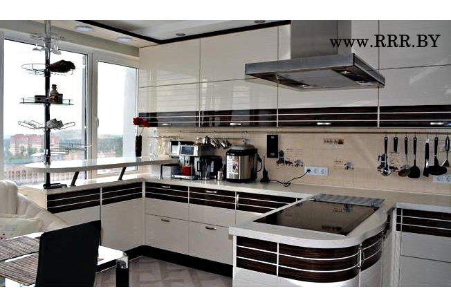 Конструкция данной модели предполагает специальное пространство для духового шкафа и плиты, вытяжки и другой бытовой техники упрощающей быт. Эффект дополняется отличными эстетическими качествам: лучшие черты современного дизайна при проектировке кухонь можно увидеть на данном примере.