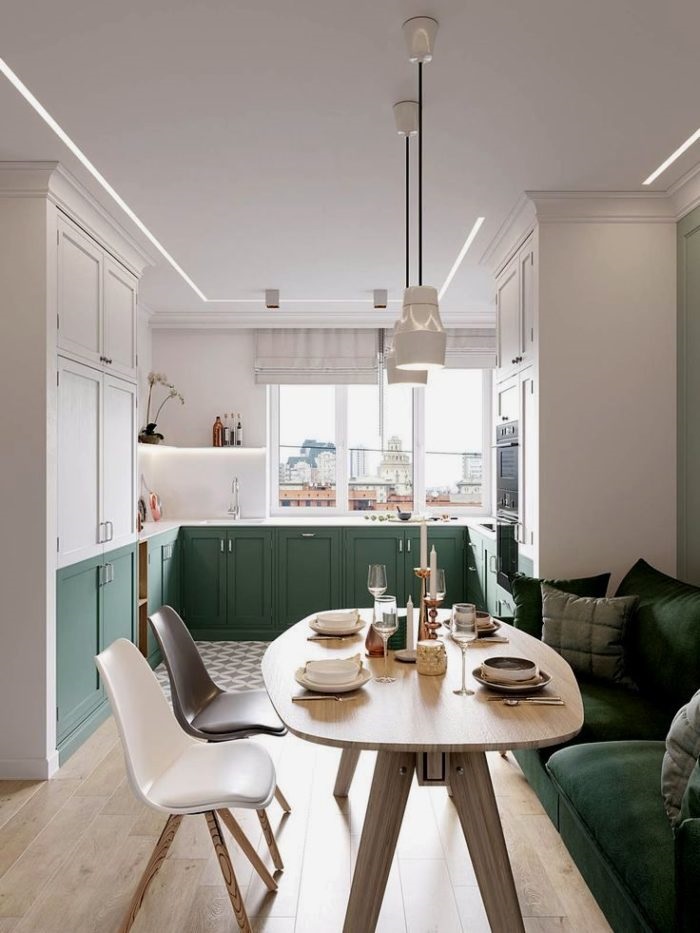Современная линейная кухня. Разные цветовые решения фасадов и столешницы.