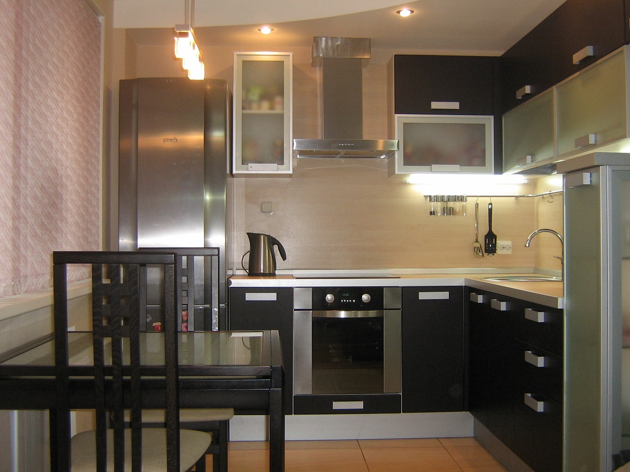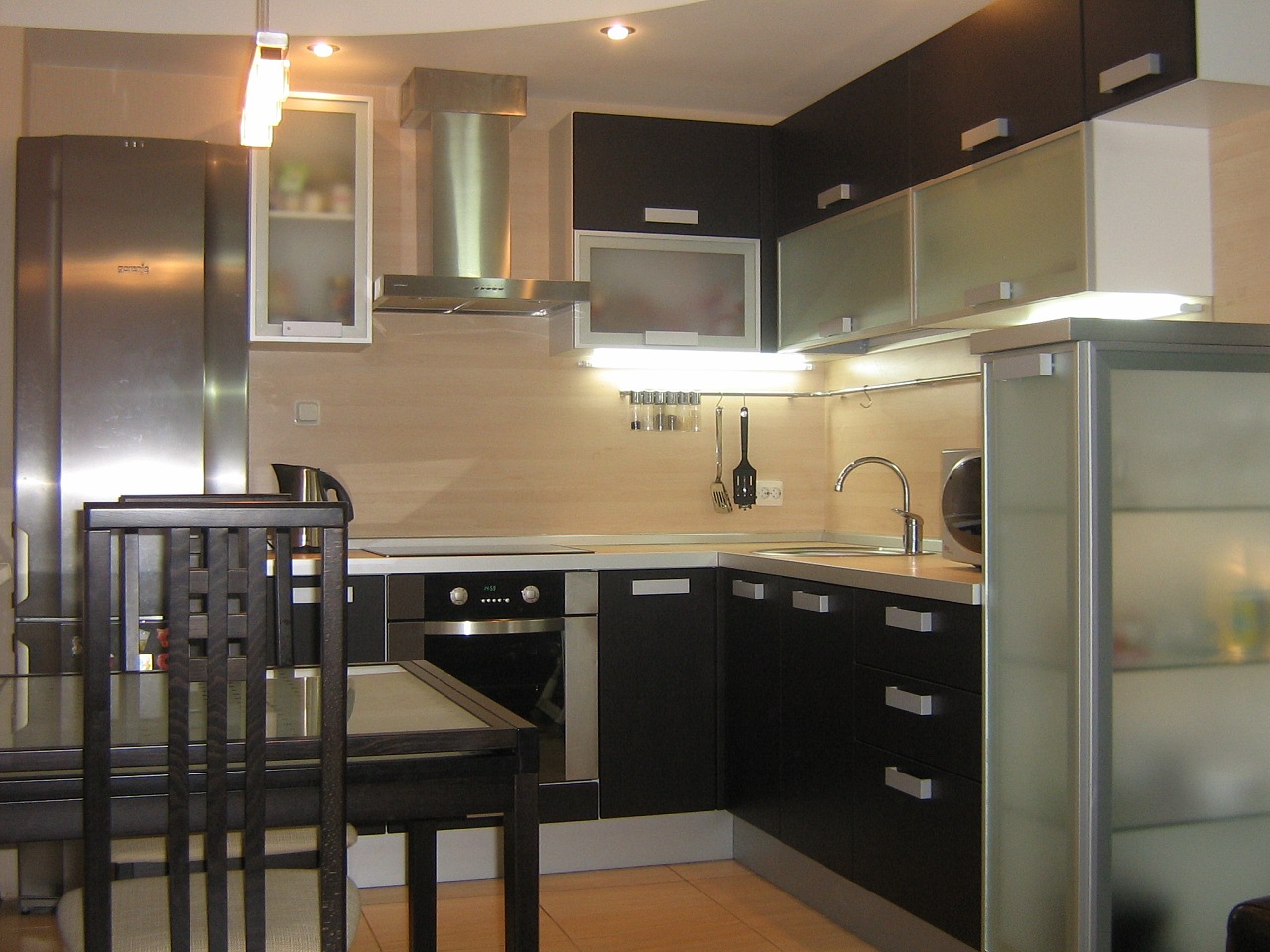 Алюминиевый профиль кухни со вставками в пескоструйной обработке. Встроенная бытовая техника.
