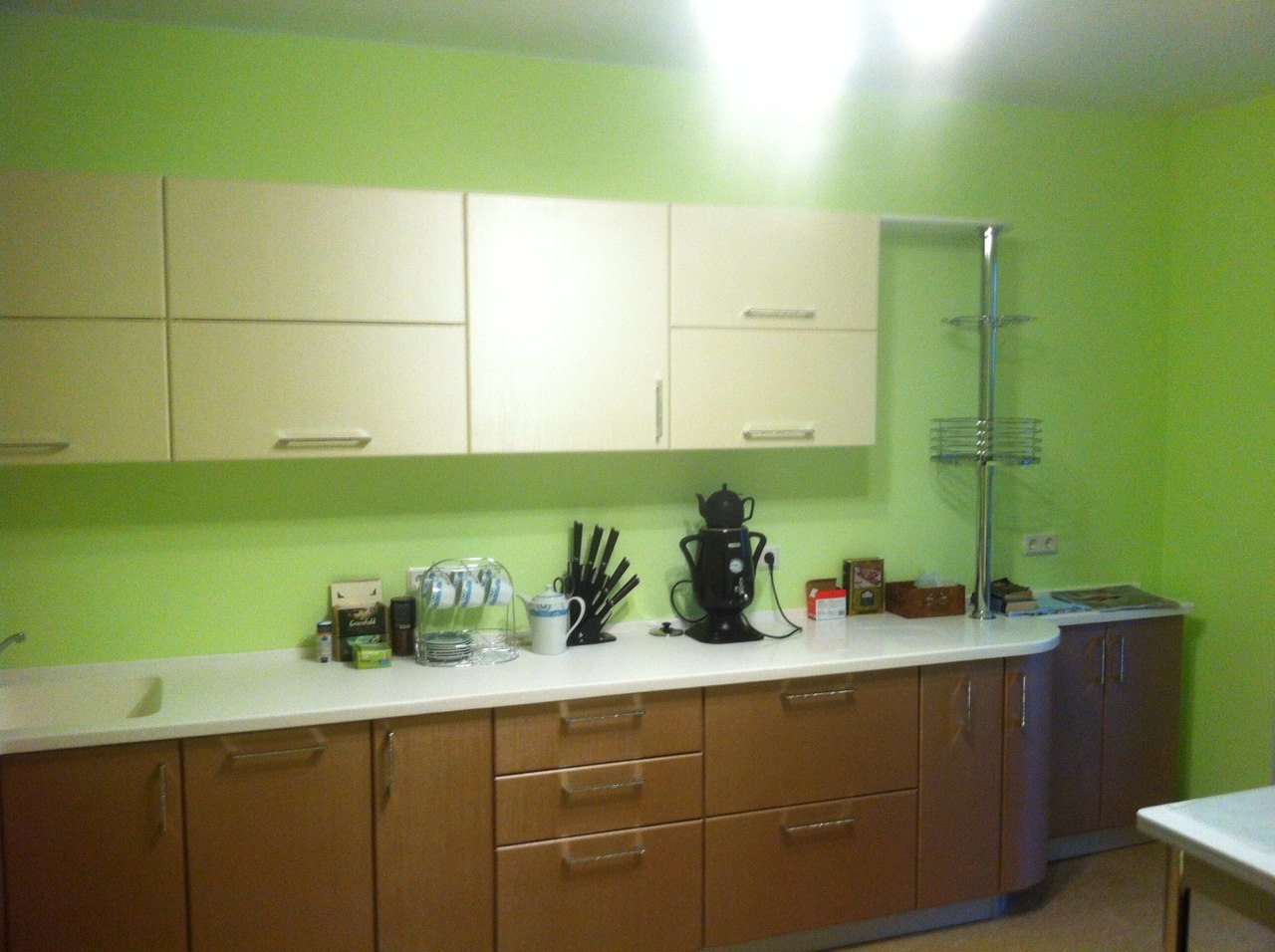 Удлиненные ручки из металла. Глухие фасады из матовой ЛДСП.