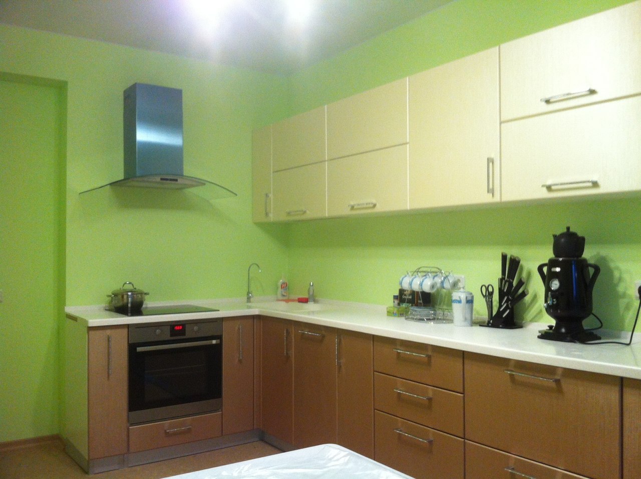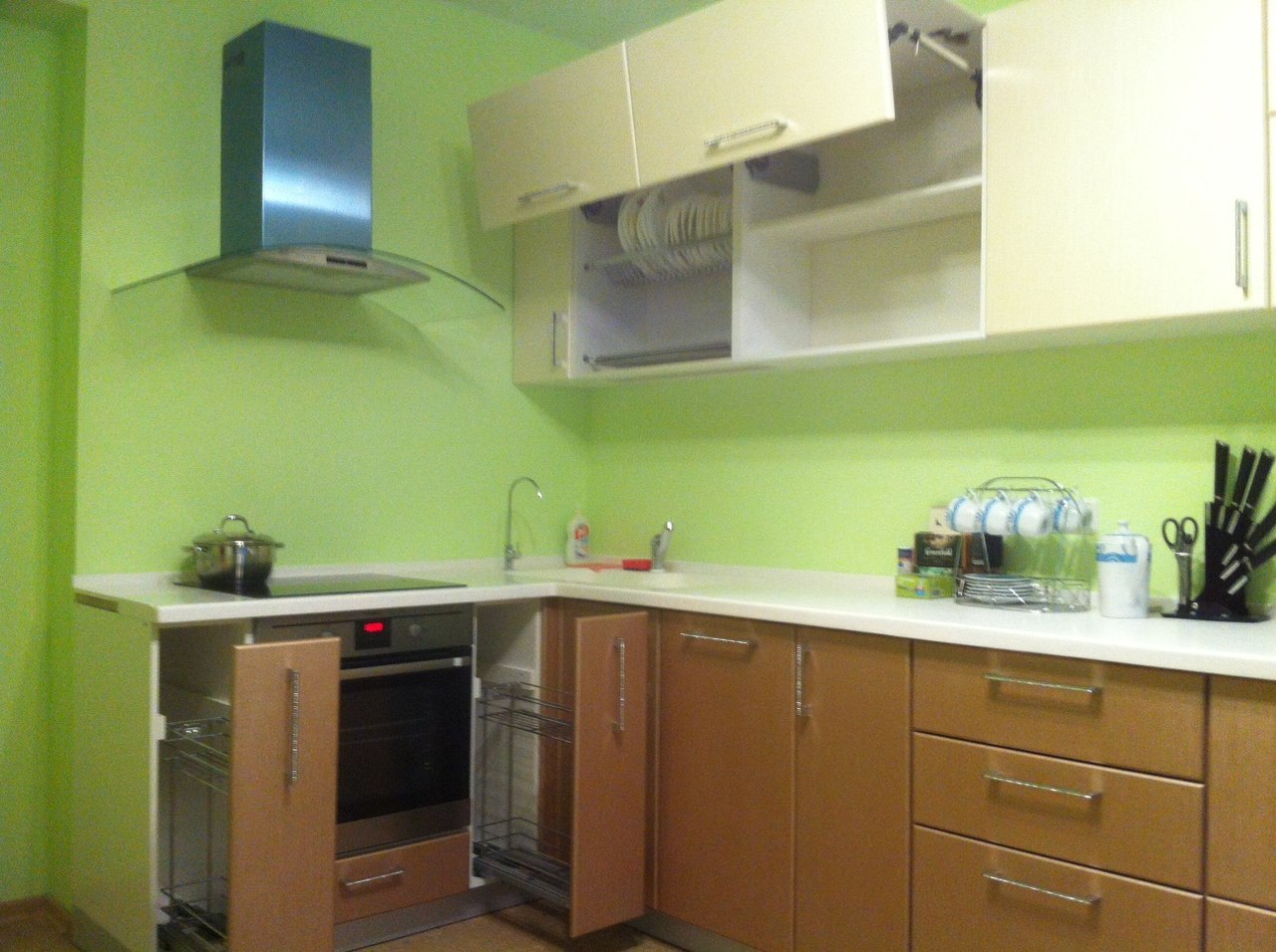 Верхние фасады со стеклом. Ширина кухни 220 см.