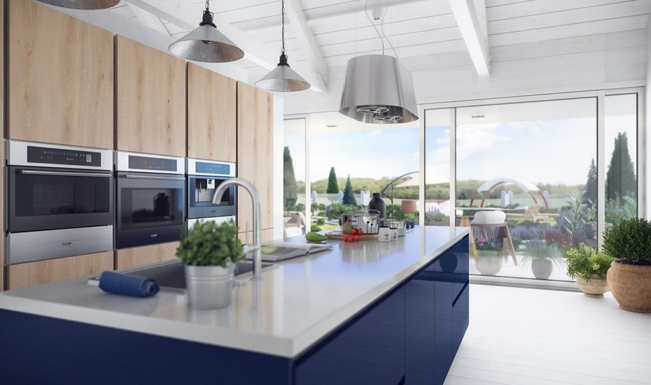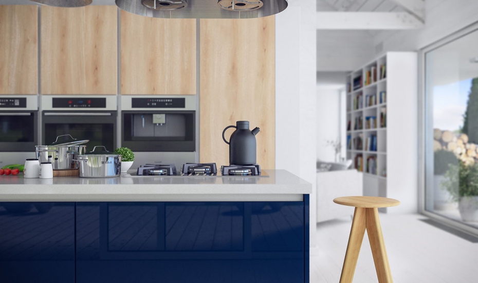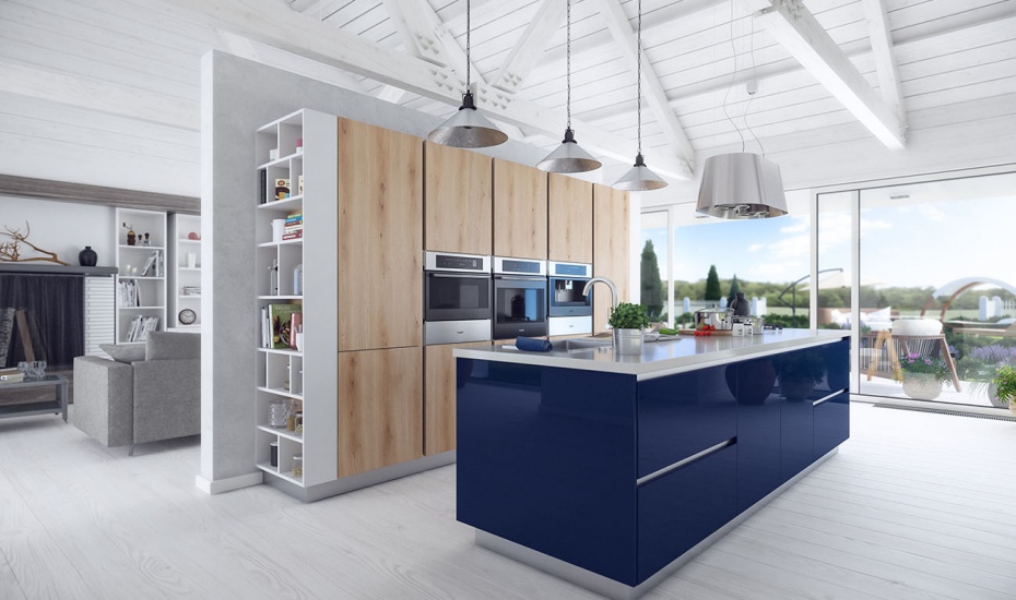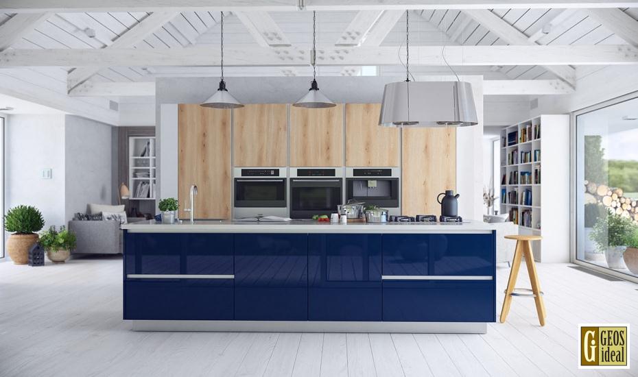 Кухня "Калипсо" – это невероятное разнообразие материаов фасада: дуб, ясень, панели FENIX, BRILLIANT, CRYSTAL; использование системы Gola, яркие цветовые акценты открытых ниш, идеальные поверхности.