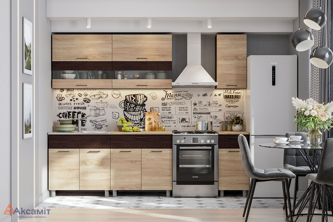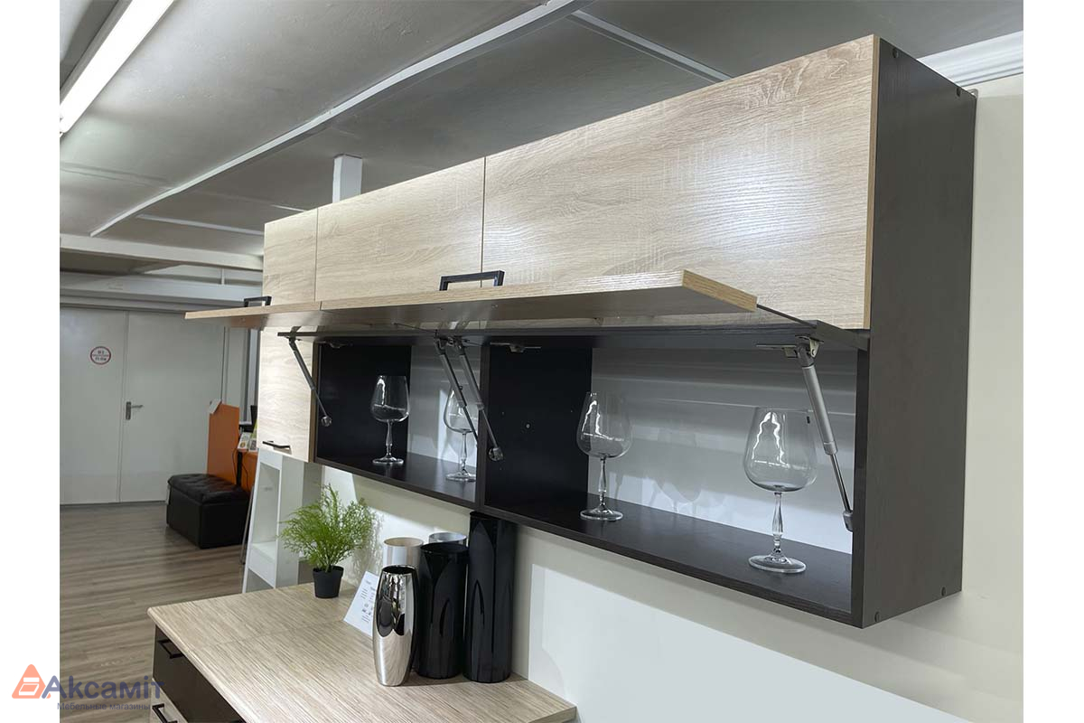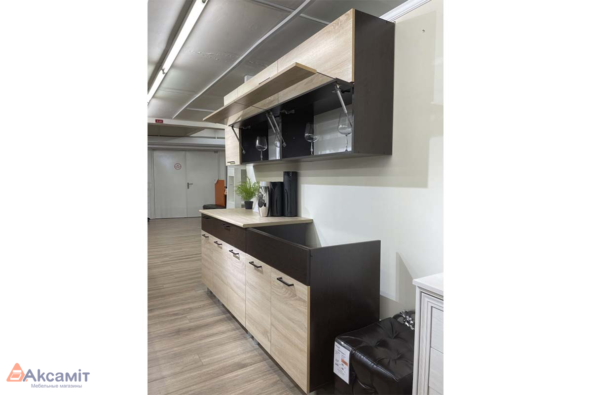 Верхние фасады со стеклом. Ширина кухни 210 см.