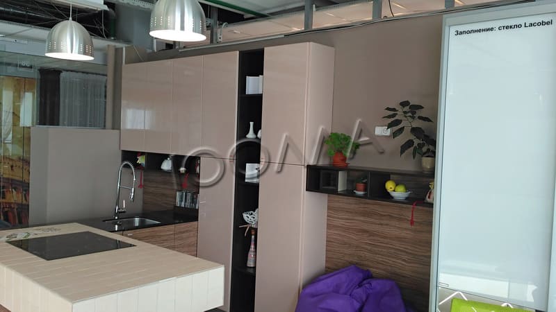 Верхние фасады со стеклом. Ширина кухни 200 см.