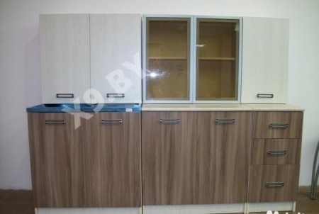 Готовый гарнитур с комбинированными фасадами из ЛДСП. Ширина кухни 230 см.