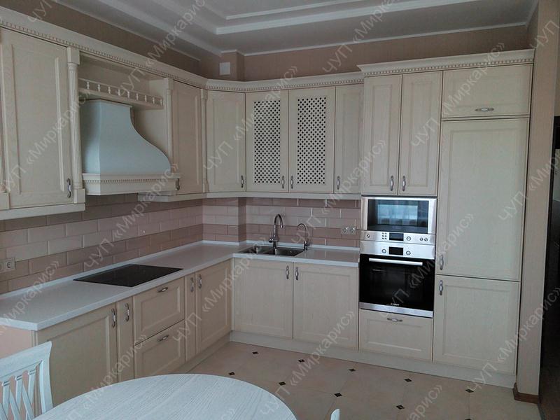 Светло-бежевая угловая кухня придется по вкусу любителям классики, поскольку выполнена в классическом стиле с использованием оригинальной фрезеровки в дизайне фасадов и стильных прорезях в дверцах верхнего модуля.