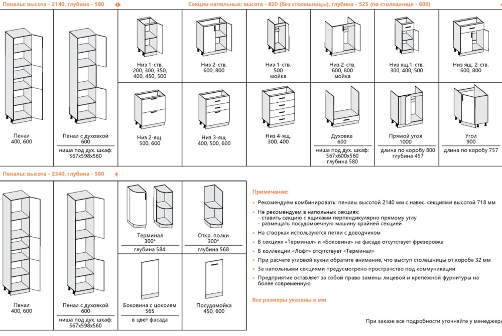 Высота навесных шкафов 72 см, напольных тумб – 85 см (со столешницей).