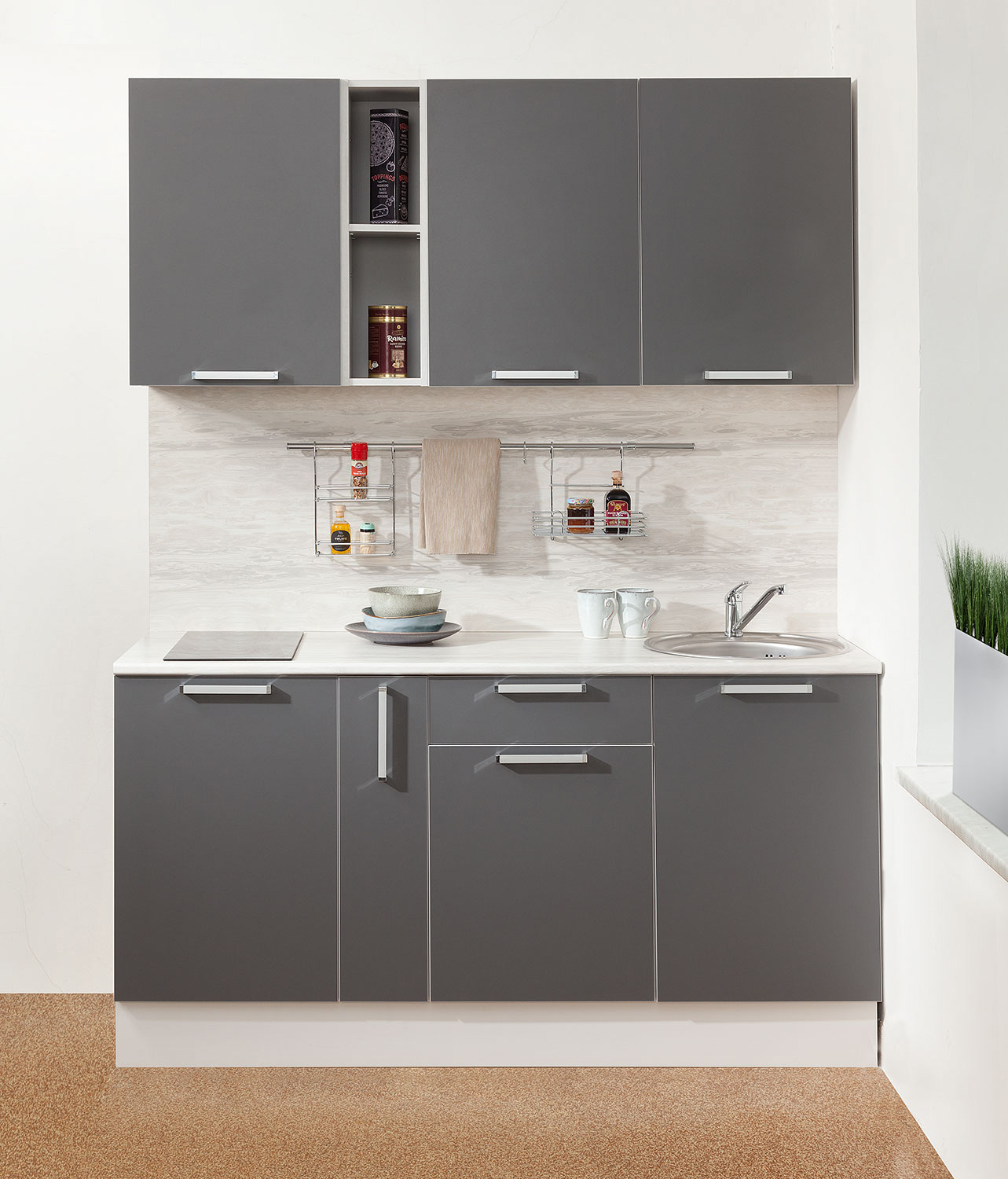 Матовые фасады с ручками из металла. Ширина кухни 180 см.