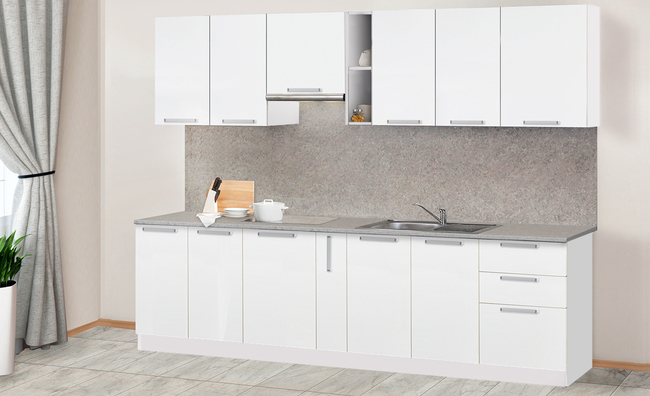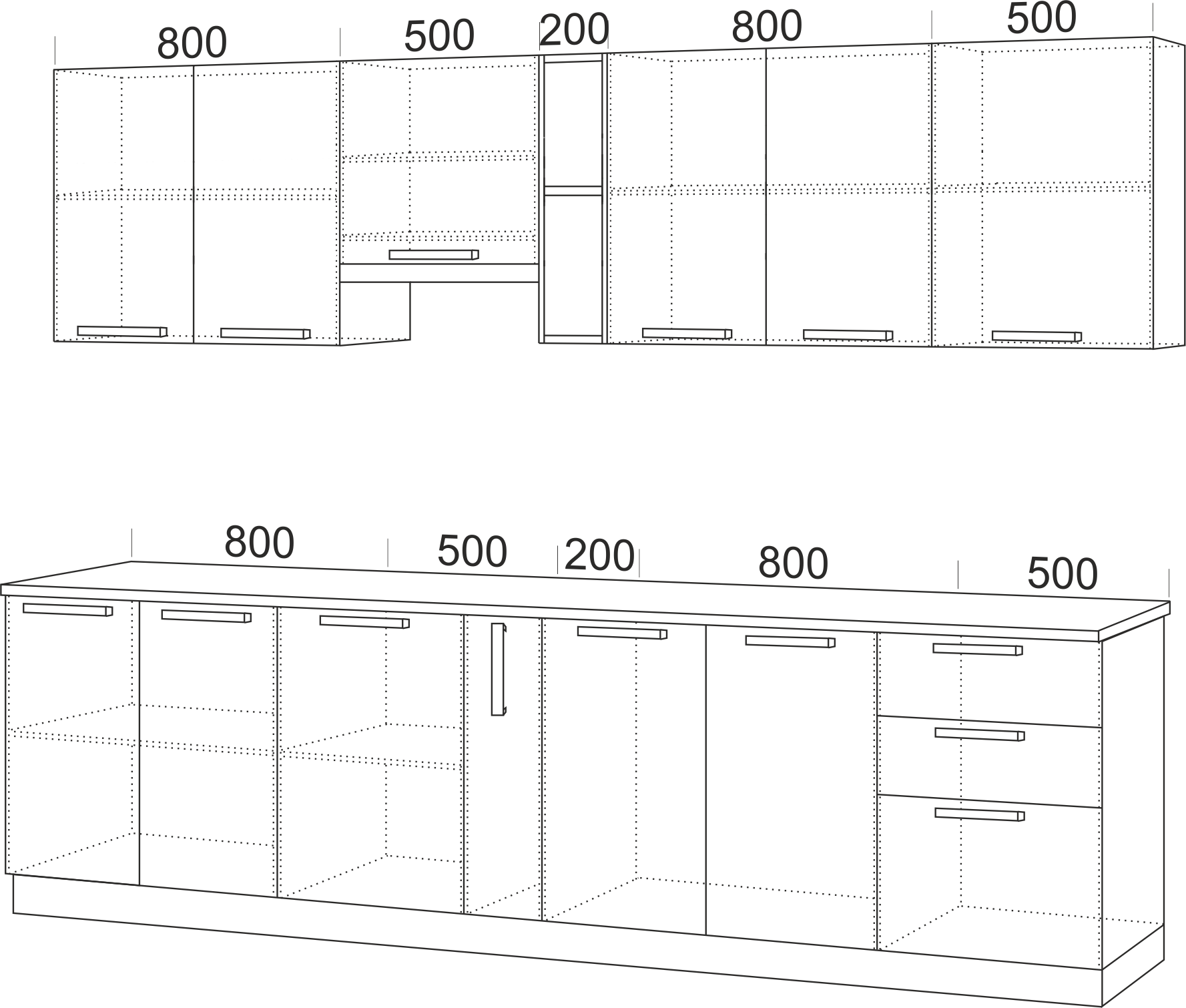 Материал фасада и корпуса: ЛДСП 16 мм. Ширина кухни 230 см.