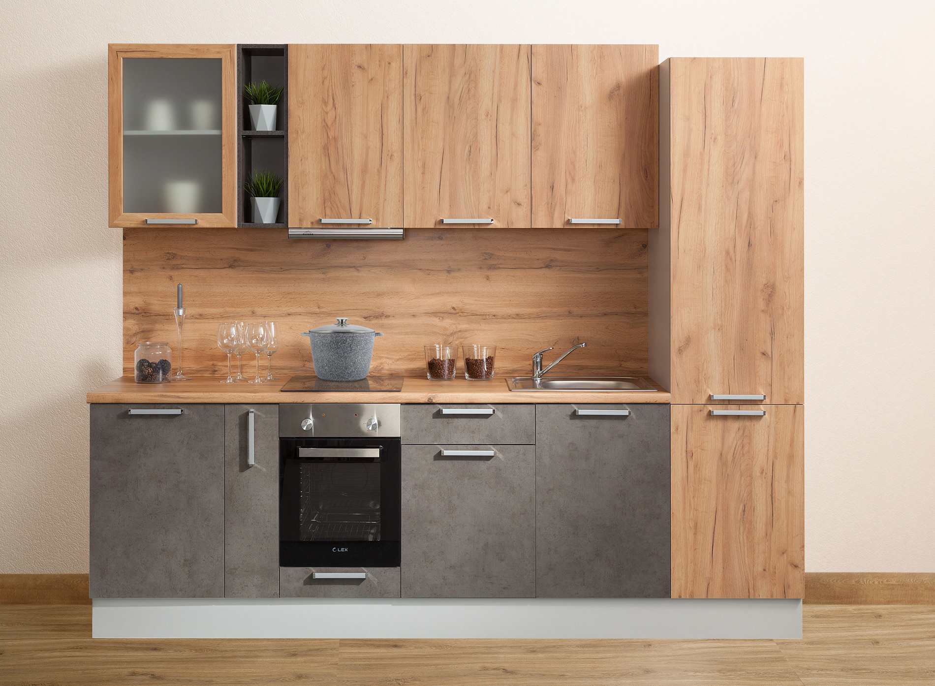 Фасад из дуба, корпус - ДСП 16 мм, цвет – «рустикаль», витражи.