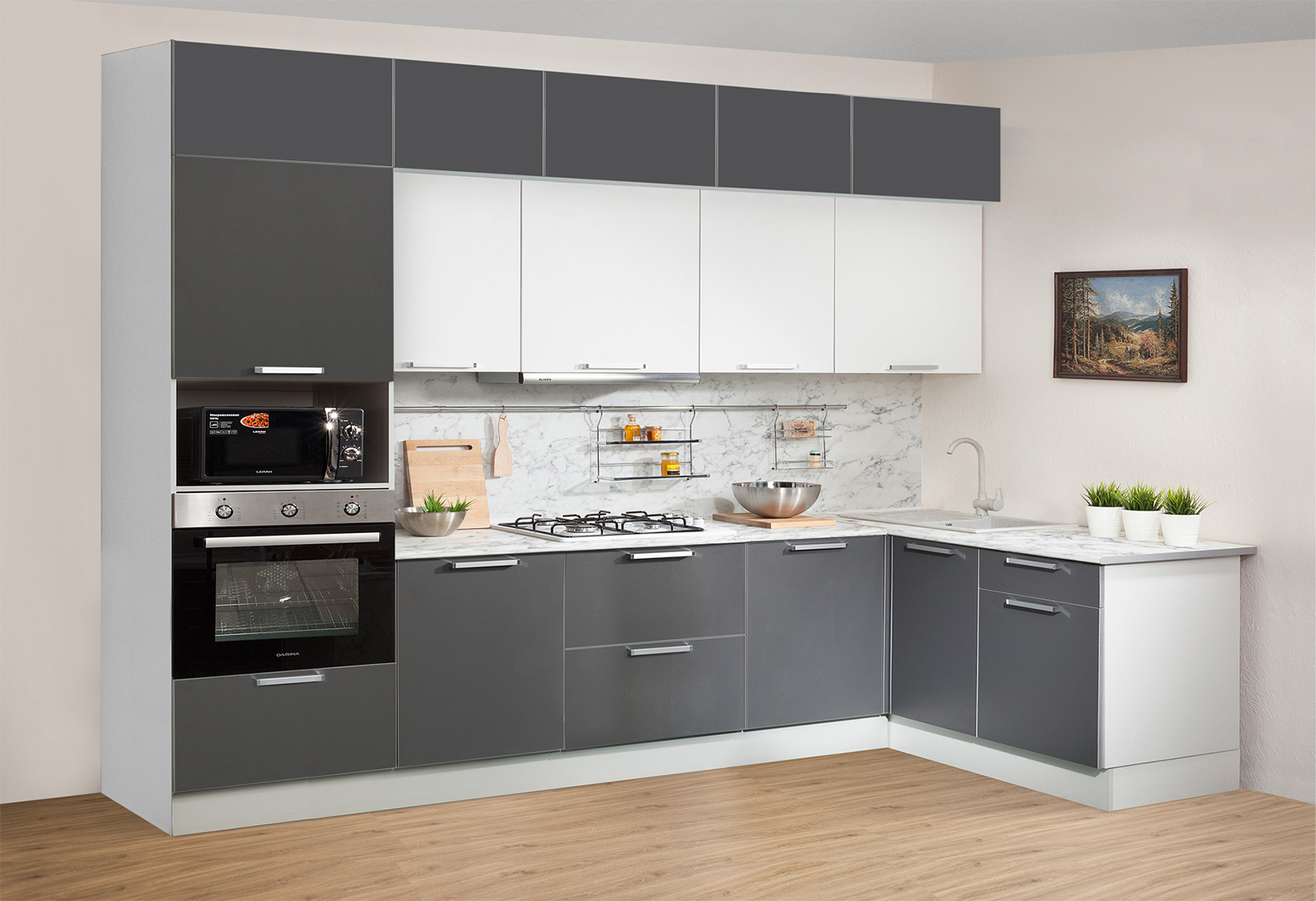 Готовый гарнитур с комбинированными фасадами из ЛДСП. Ширина кухни 180 см.