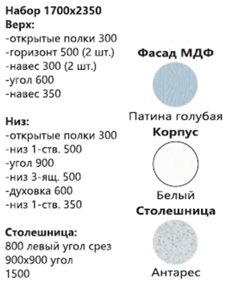 Материал фасада и корпуса: ЛДСП 16 мм. Ширина кухни 210 см.